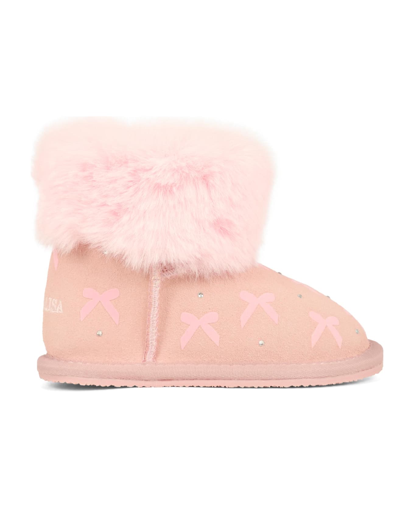 Pink suede ankle boots, with rubber soles, faux fur lining, and faux fur detail on the upper. They are embellished with rhinestones and an all-over bow and with an embroidered logo on the back.
