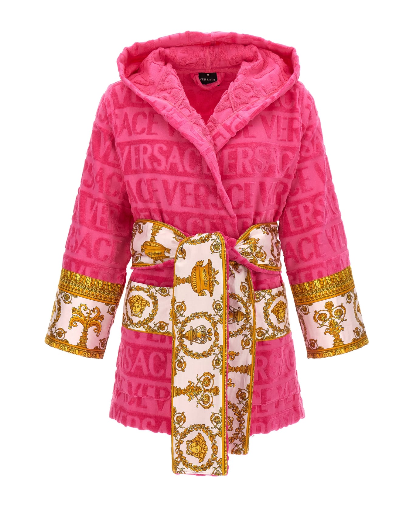 'I Heart Baroque' short cotton terry bathrobe with all-over logo, contrast edges and pockets, a belt.