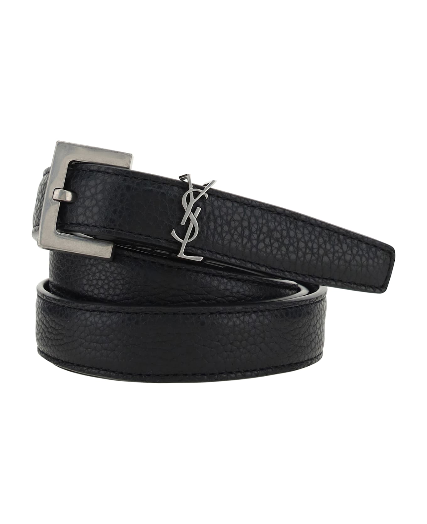 Saint laurent's cassandre leather belt is a refined accessory that combines elegance and character. made of grained leather, it stands out for its unique and sophisticated texture. the square buckle with a clean design perfectly matches the loop detail, embellished with the iconic ysl logo, a symbol of exclusivity and style. with a thickness of 2 cm, this belt is versatile and ideal for completing both formal and casual outfits with class.