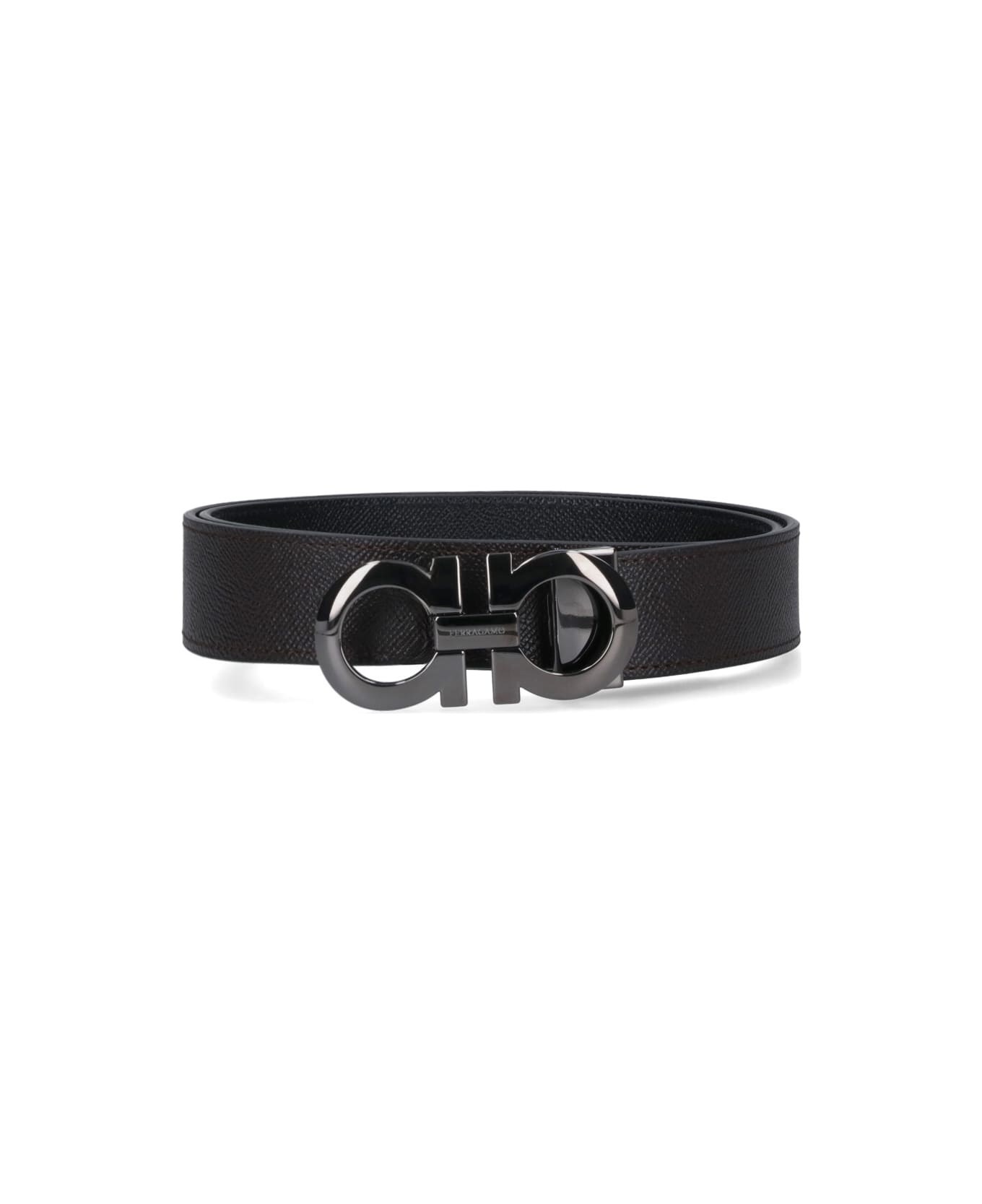 Salvatore Ferragamo Reversible 'Gancini' Belt, hammered calfskin, brown on one side and black on the other side, iconic Gancini buckle, engraved lettering logo, adjustable and reversible.