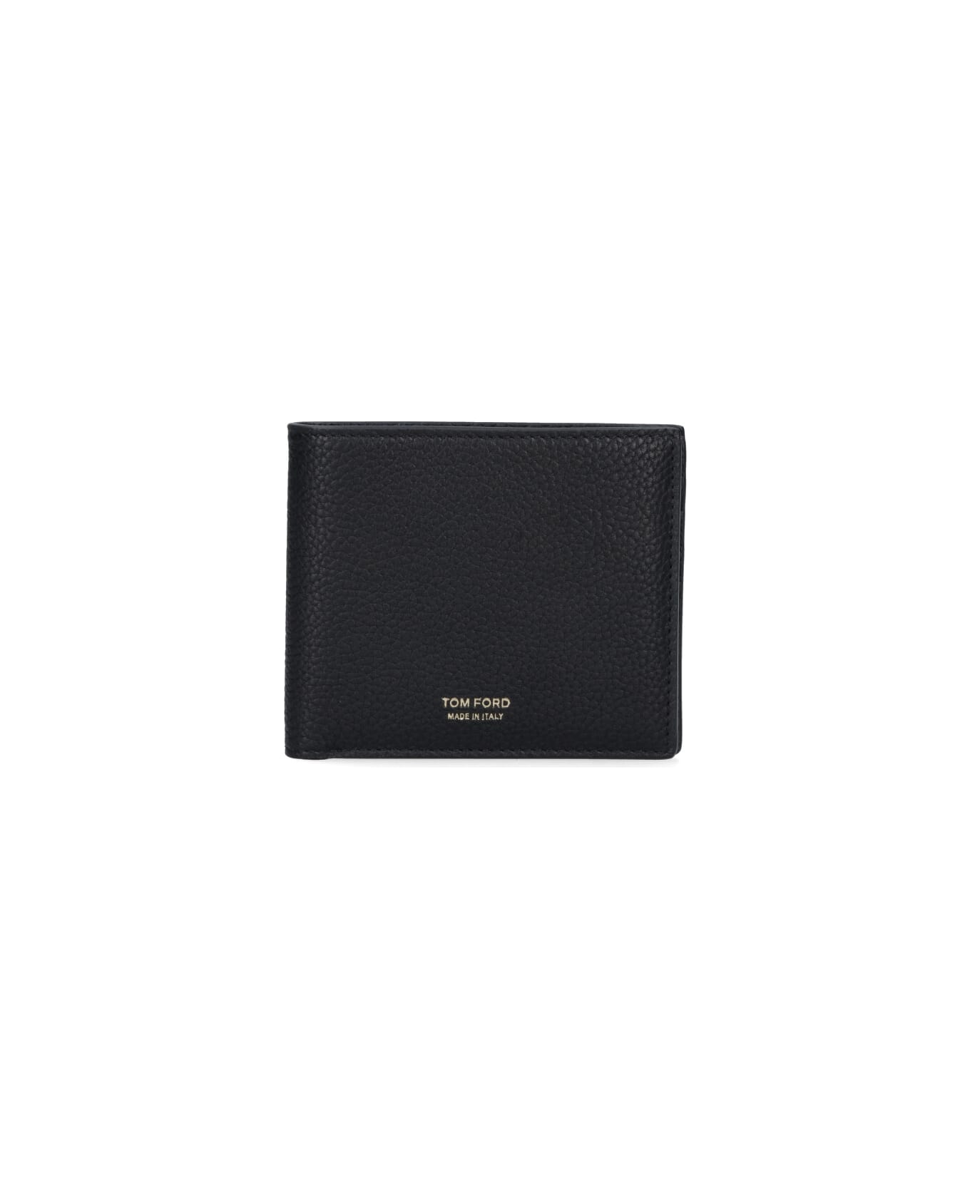 Tom Ford bi-fold wallet in black calf leather with gold logo embossed on the front, eight inner card slots, and an inner bill compartment. Composition: 100% Calf Leather