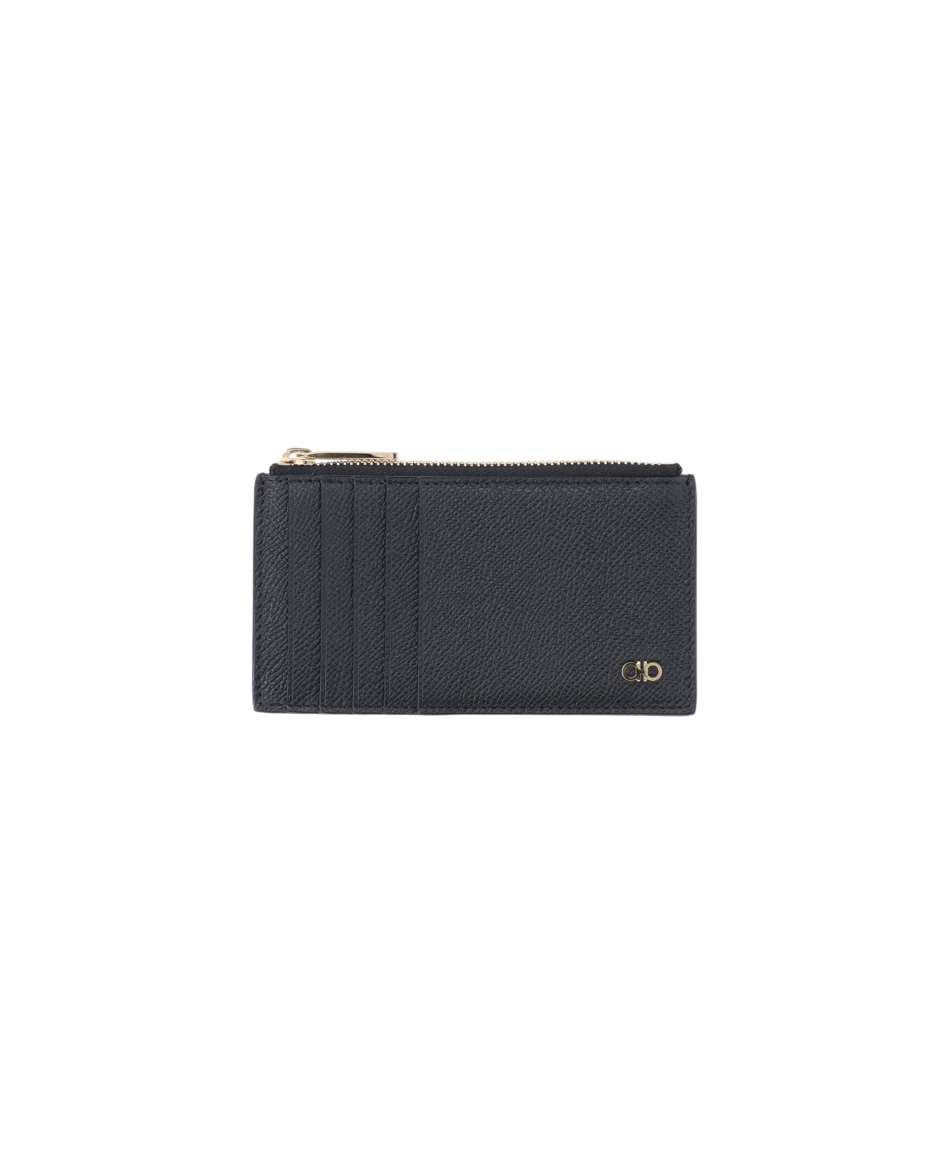 Ferragamo Gancini card holder in black calf leather, gold metal "Gancini" logo detail on the front, top zip closure, five card slots on the back and back, and one main zip pocket. Composition: 100% Calf Leather