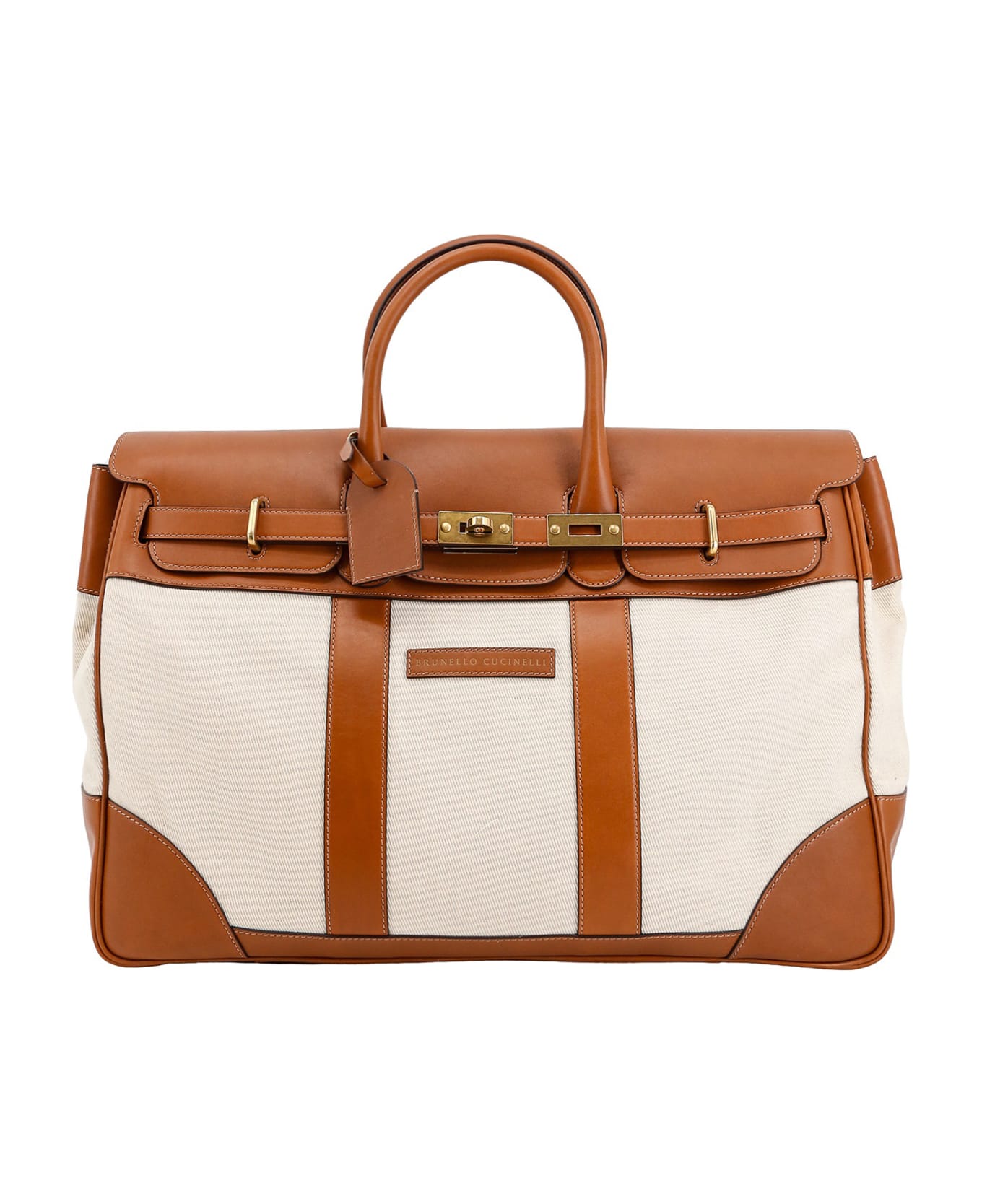 Leather and canvas duffle bag with frontal logo patch
