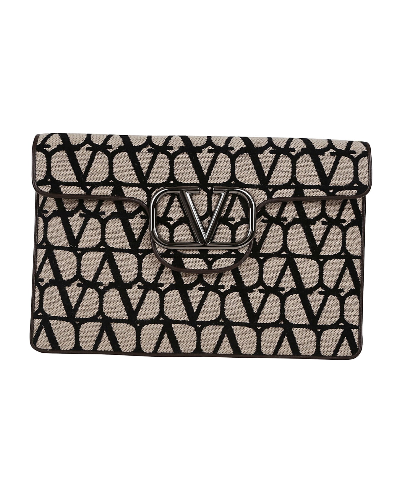 Clutch bag in all-over Toile Iconographe print fabric BY VALENTINO GARAVANI. Snap button closure with Locò logo plaque. Detail profiles in leather.