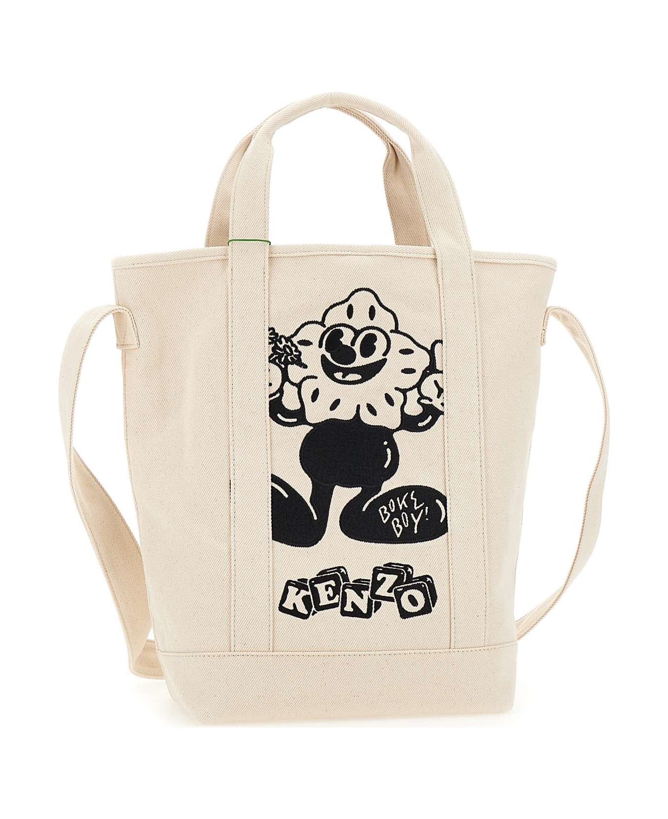 Kenzo Paris "Tote Boke Bag" men's shoulder bag in cotton canvas, ivory color, contrasting black Boke Boy embroidery on front and back, silver hardware, internal fastening with hook, double handle, shoulder strap, internal pocket, external pocket, logo patch iconic. Measurements: length 26 cm, height 38cm, depth 15cm.