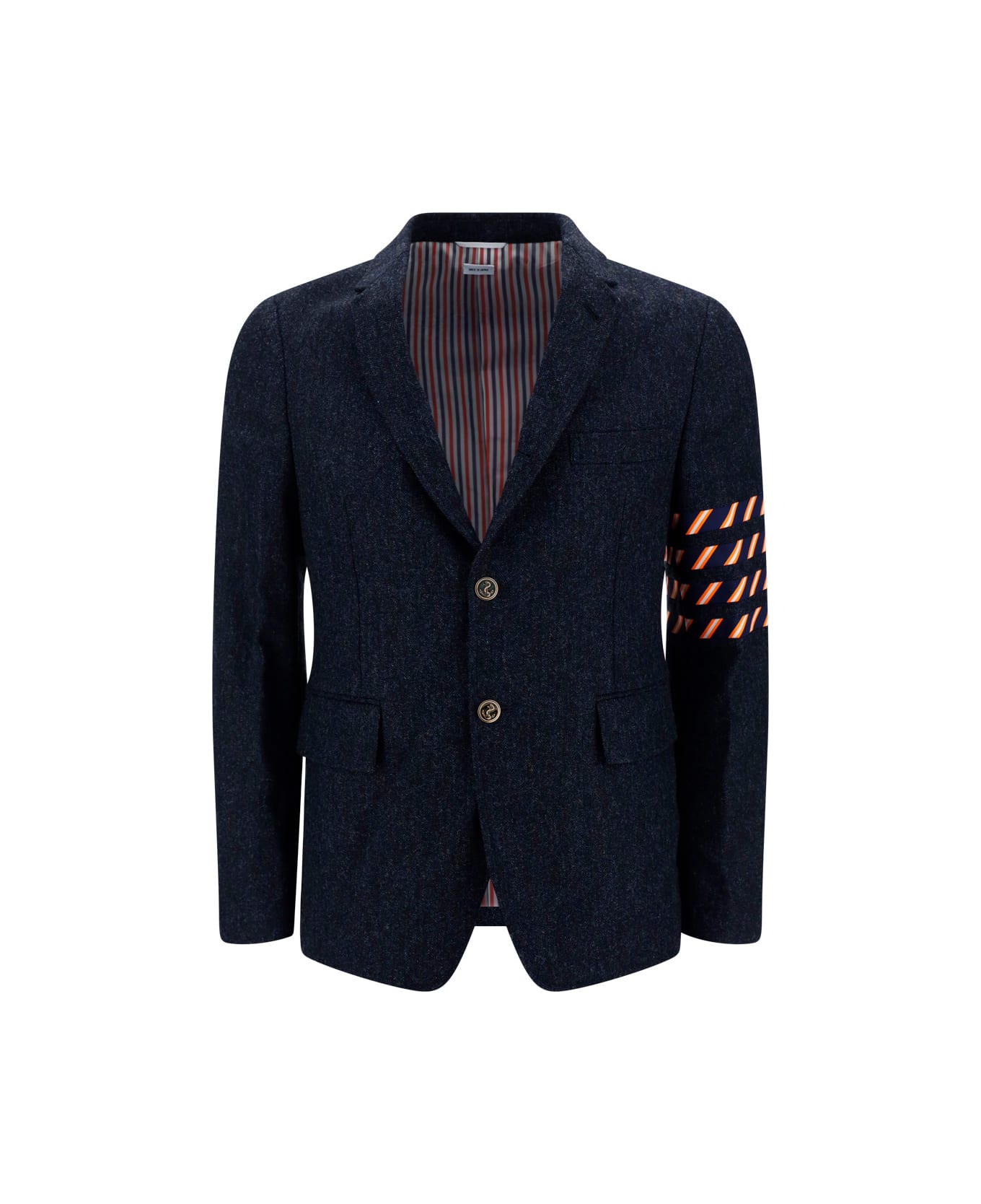 Wool classic sport coat by thom browne, classic lapels, front closure with engraved buttons, adjustable button cuffs, two welt pockets with flaps on the front, multicolored applique bands on the left arm, two slits on the back, iconic embroidered tricolor label on the back, invisible tricolor martingale detail on the back, brand-typical striped patterned lining.