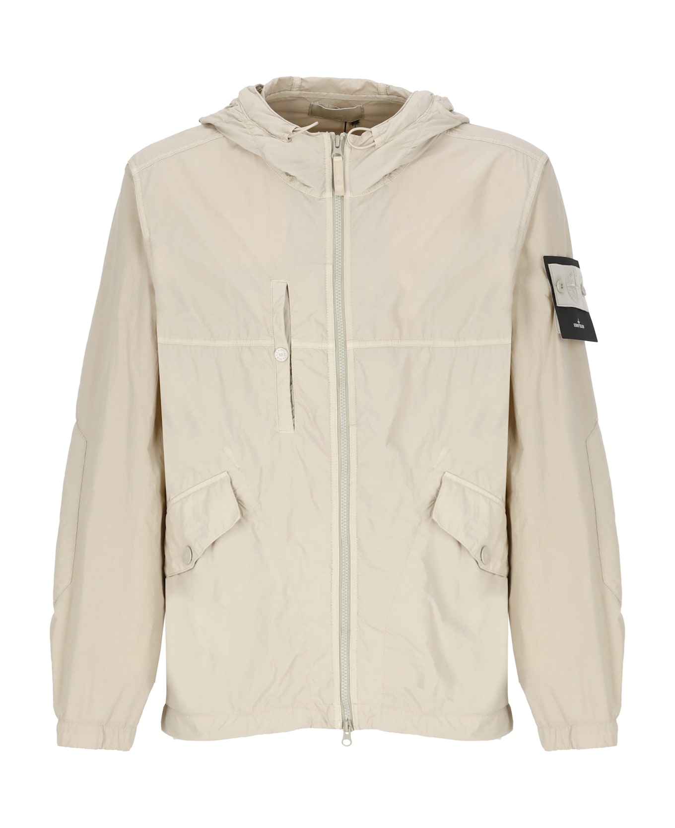 - Beige Stone Island jacket for man - Hood - Long sleeves - Two side flap pockets with snap button - Front zip fastening - Iconic tone on tone removable loged patch at left sleeve
