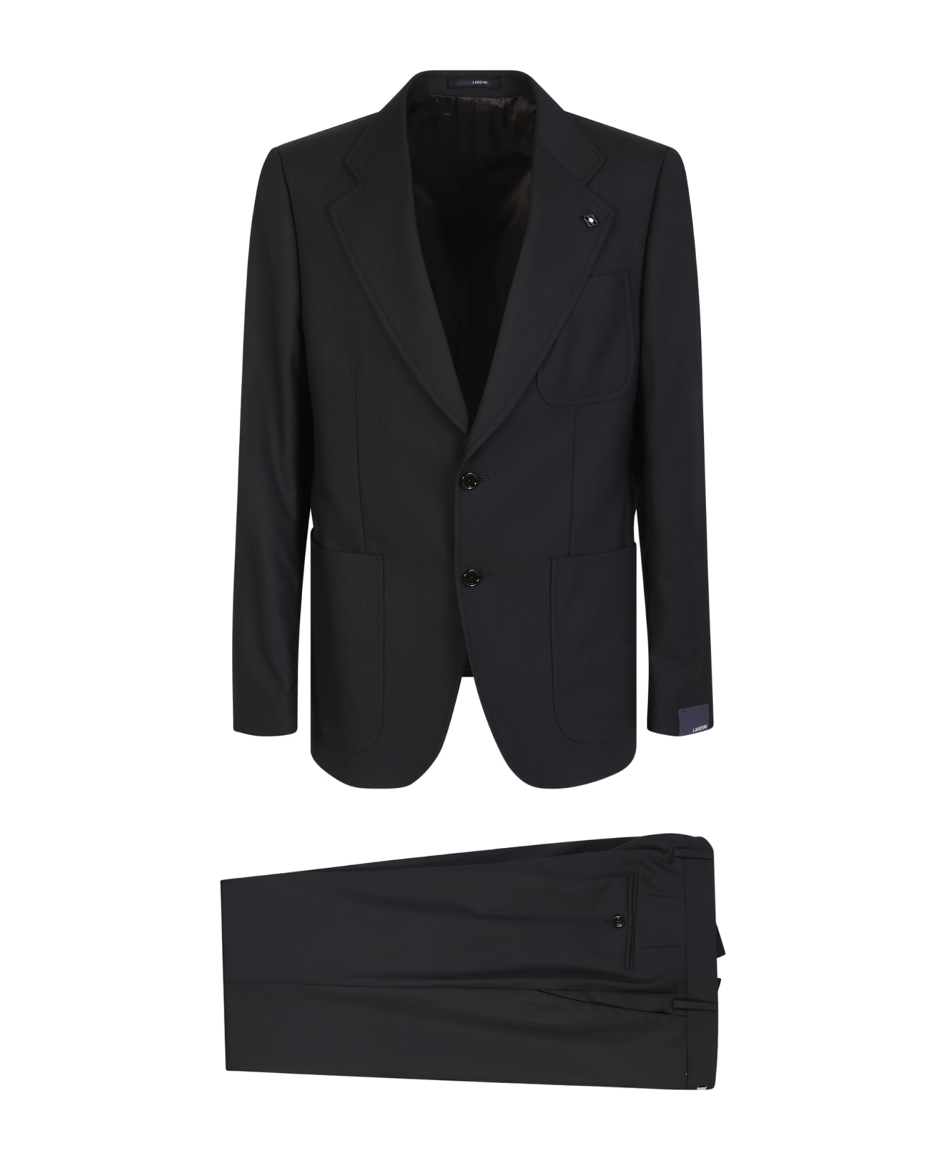 Notched lapels. Long sleeves. Front button fastening. Chest welt pocket. Two front flap pockets. Regular waist. Belt loops. Two side inset pockets. Rear welt pocket. Straight cut. Color: black