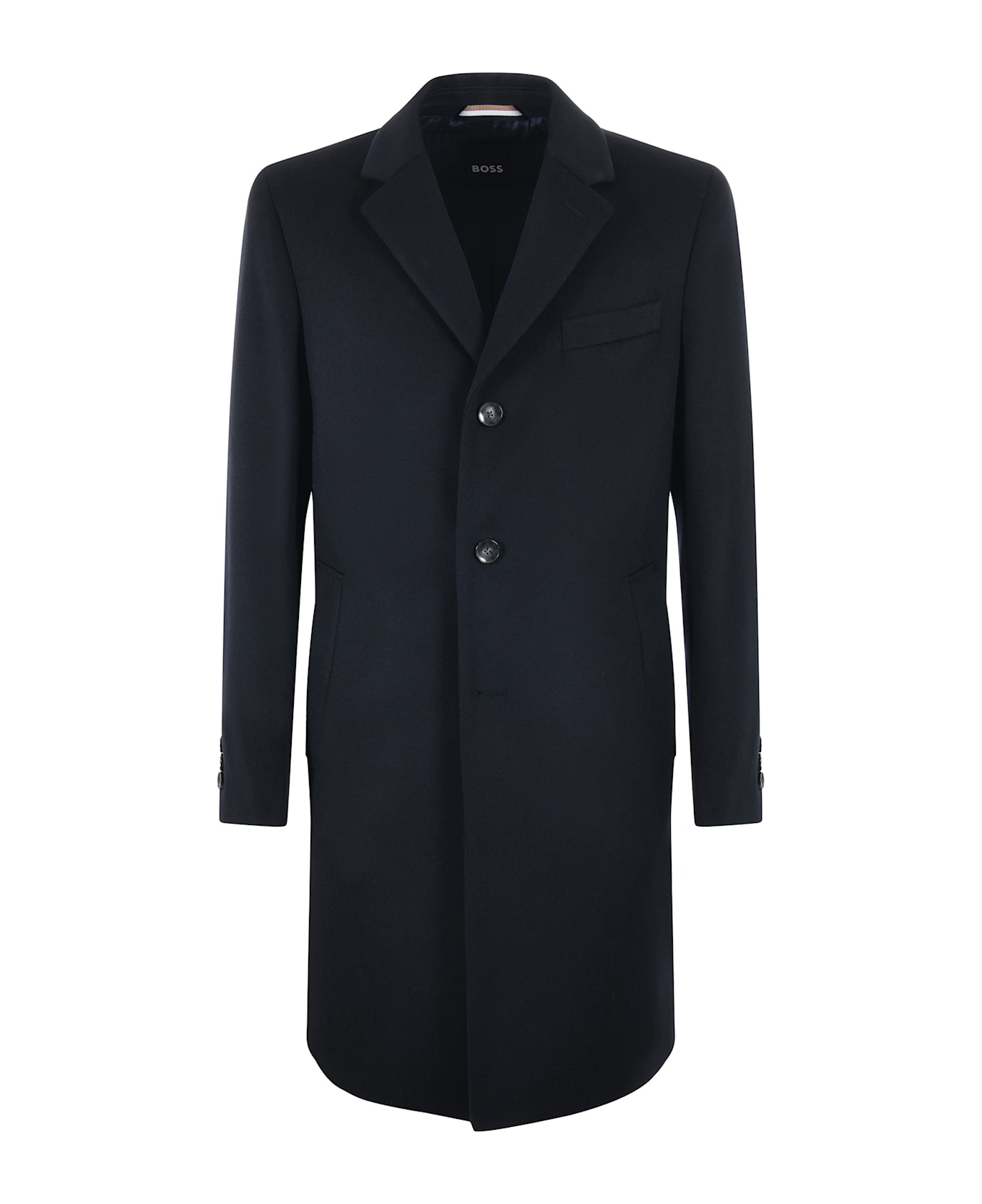 Hugo Boss coat in wool and cashmere Dark blue. Classic lapel with buttonhole. Closure with 3 buttons. Welt pocket on the chest. Front slant pockets. Buttons at the cuffs. Central vent on the back. Logoed lining. Measurement in photo 48 90% wool 10% cashmere