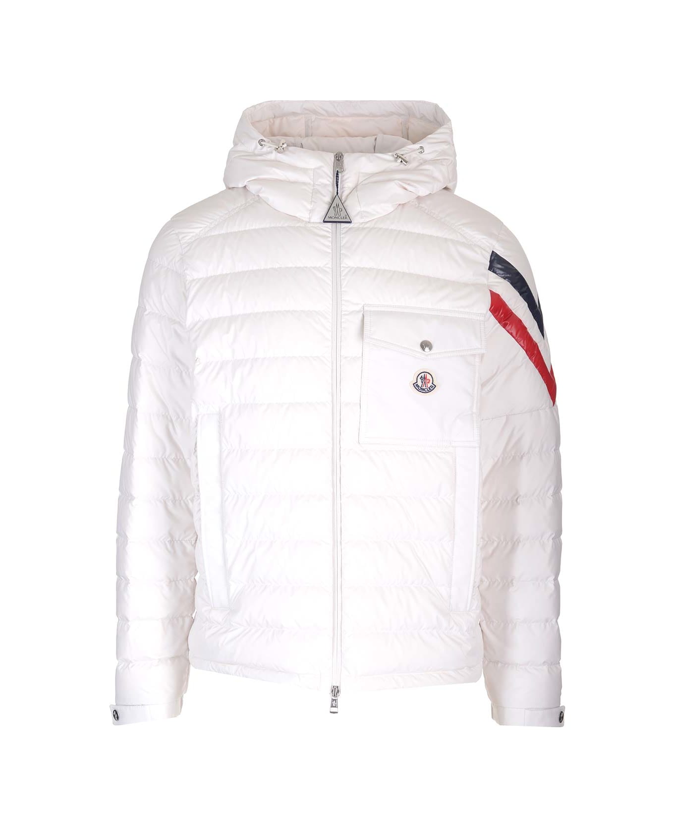 White 'Berard' short down jacket from Moncler in nylon laqu?, down padding, removable and adjustable hood with drawstring, front zip closure, collar with snap button, external pockets with zip, patch pocket with snap button, adjustable cuffs with buttons logoed snap closures, adjustable bottom of the garment with elastic drawstring, two-tone inlay detail on one sleeve.