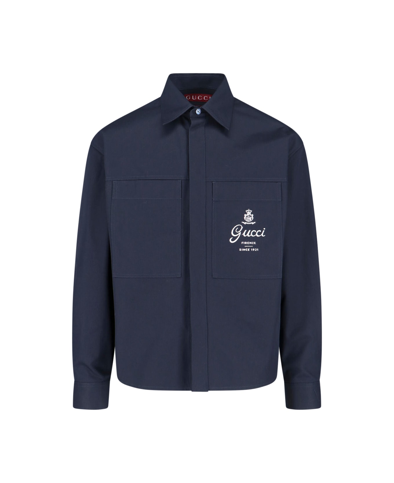 Dark blue cotton twill shirt with Gucci print, classic collar, concealed button closure, logo print on the chest, two maxi chest pockets, button cuffs, straight hem. Composition: 100% Cotton