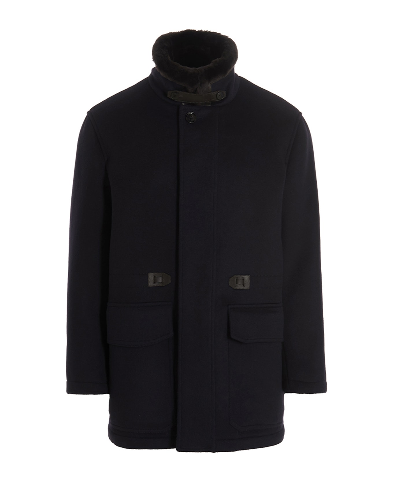 Wool jacket with a fur high neck, leather details, a quilted lining, a button closure, pockets, and long sleeves. Composition: 100% virgin wool