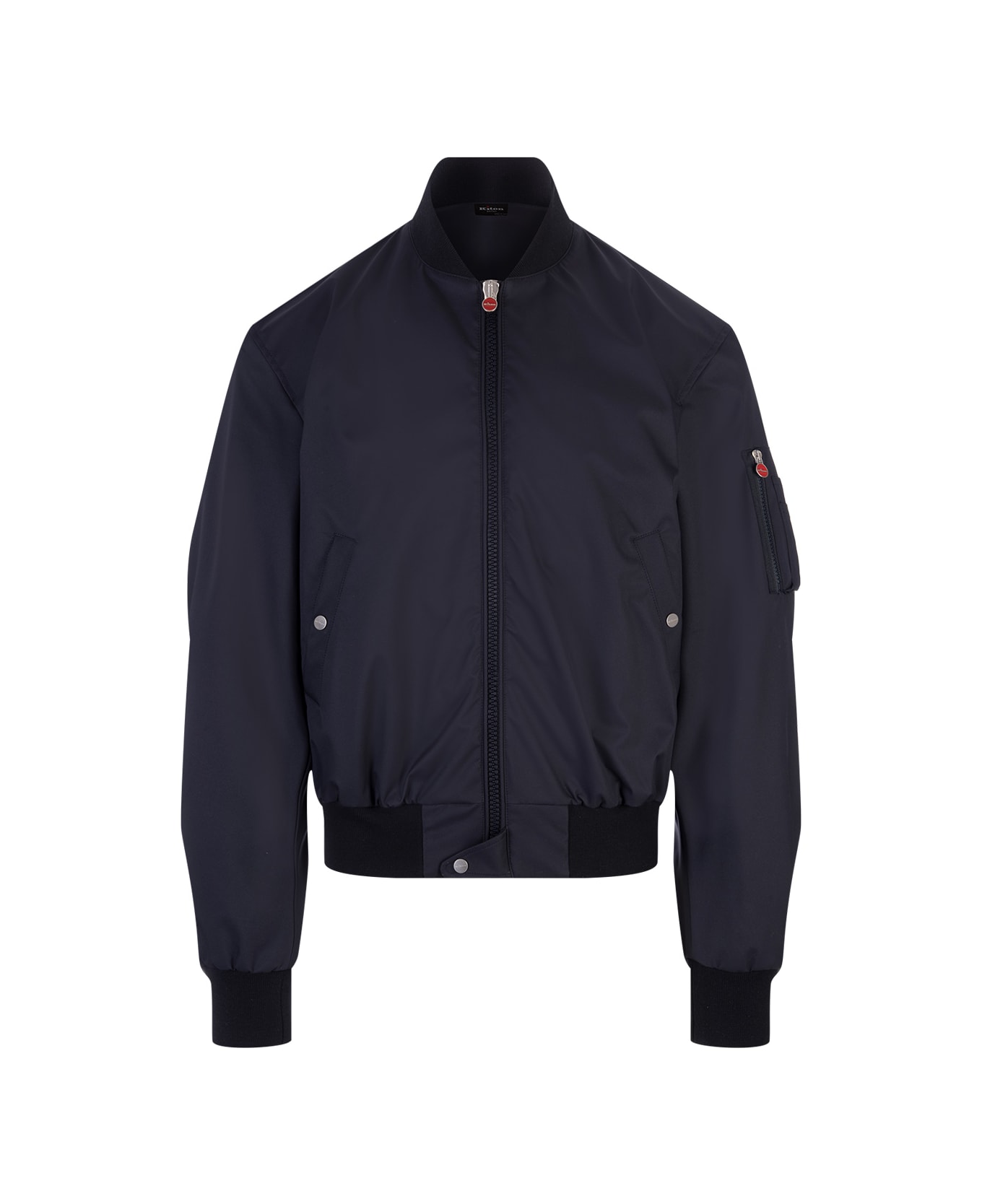 Men's Kiton bomber jacket made of navy blue nylon with ribbed stretch knit profiles. Regular fit model characterised by long sleeves, small pocket on the sleeve, two side pockets with snap button, front fastening with two-way zip and single snap button on the bottom.