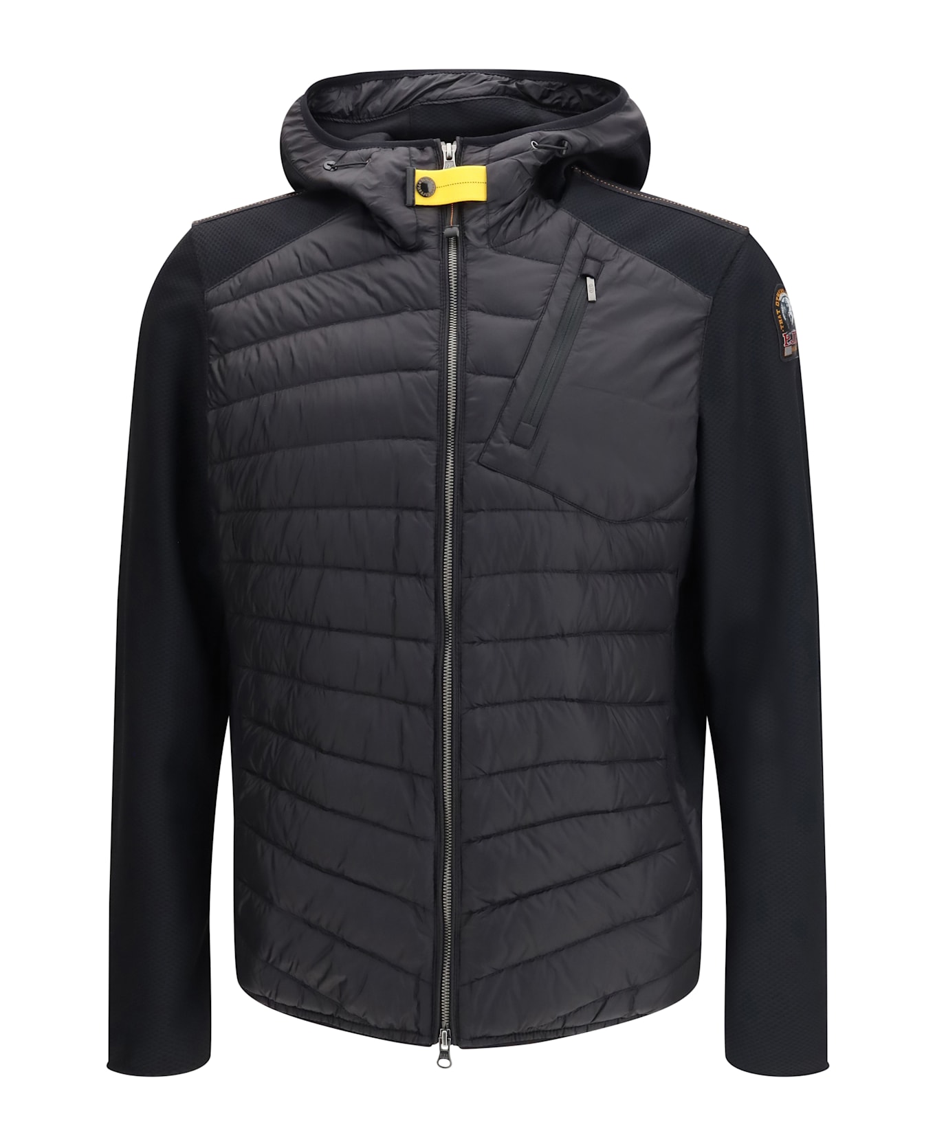 The nolan hybrid jacket by parajumpers embodies the brand s technical spirit through a design created for everyday wear with a strong functional attitude. the adjustable drawstring hood and front two-way zip fastening provide comfort and versatility, while the hybrid construction gives the piece a dynamic, contemporary feel. multiple pockets on the front, back and interior enhance its urban practicality, complemented by underarm ventilation and lycra-trimmed hood, hem and cuffs. the parajumpers patch on the sleeve and the iconic yellow tape at the neck finish the jacket with a bold, instantly recognizable signature.