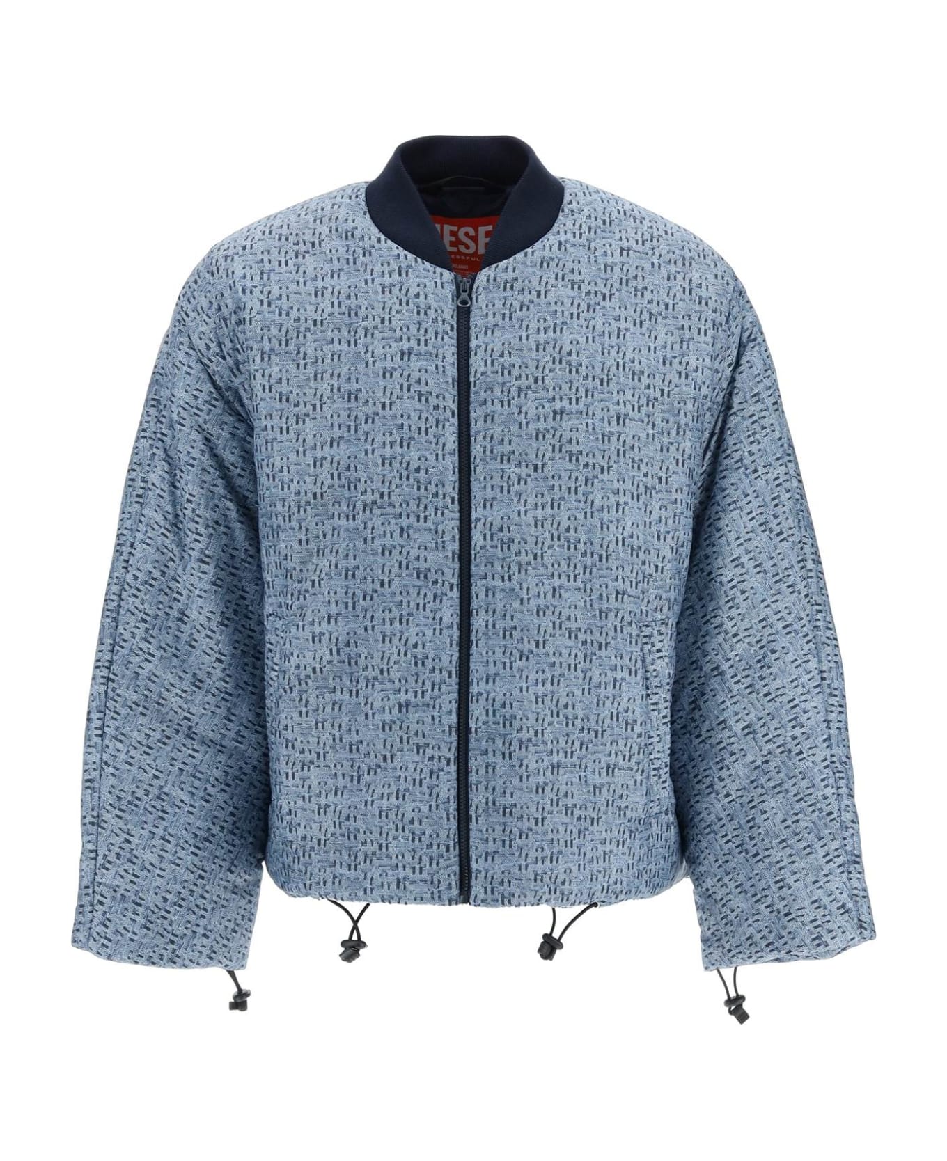 Diesel maxi bomber jacket in polyester with a denim-effect monogram print all over. Oversized boxy cut, featuring elastic drawstrings at cuffs and hem, ribbed knit collar, zip closure and welt pockets with hidden snap. Lined interior hosting two pockets. The model is 187 cm tall and wears a size L.