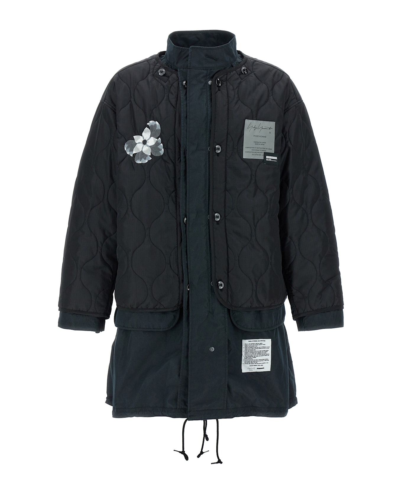 5WAY Yohji Yamamoto x NEIGHBORHOOD set consisting of reversible cotton parka, zip and button closure, patch and prints on the front and back, pockets, long cuffed sleeves, back split, drawstring at the hem, standing collar and reversible quilted fabric jacket, crew neck, button closure, patch and prints on the front and back, pockets, long sleeves. Possibility to use the two garments in 5 different ways: alone or overlapped.