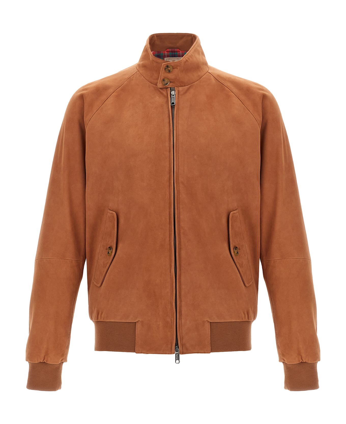 Suede bomber jacket with contrasting cotton lining, tartan fabric. Zip closure and button closure on the neck. Equipped with pockets.