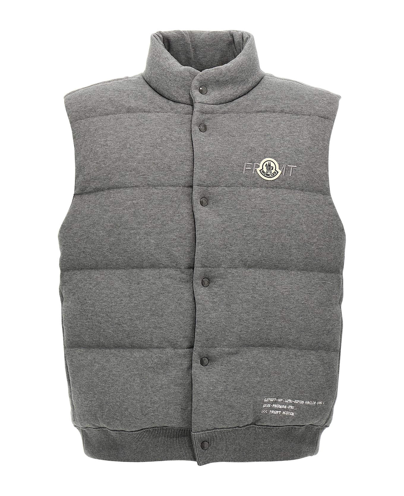Moncler x FRGMT waistcoat in 14-gauge shaved cotton knit, down-padded nylon lining, embroidery and front felt logo patch, high neck, snap button closure, pockets.