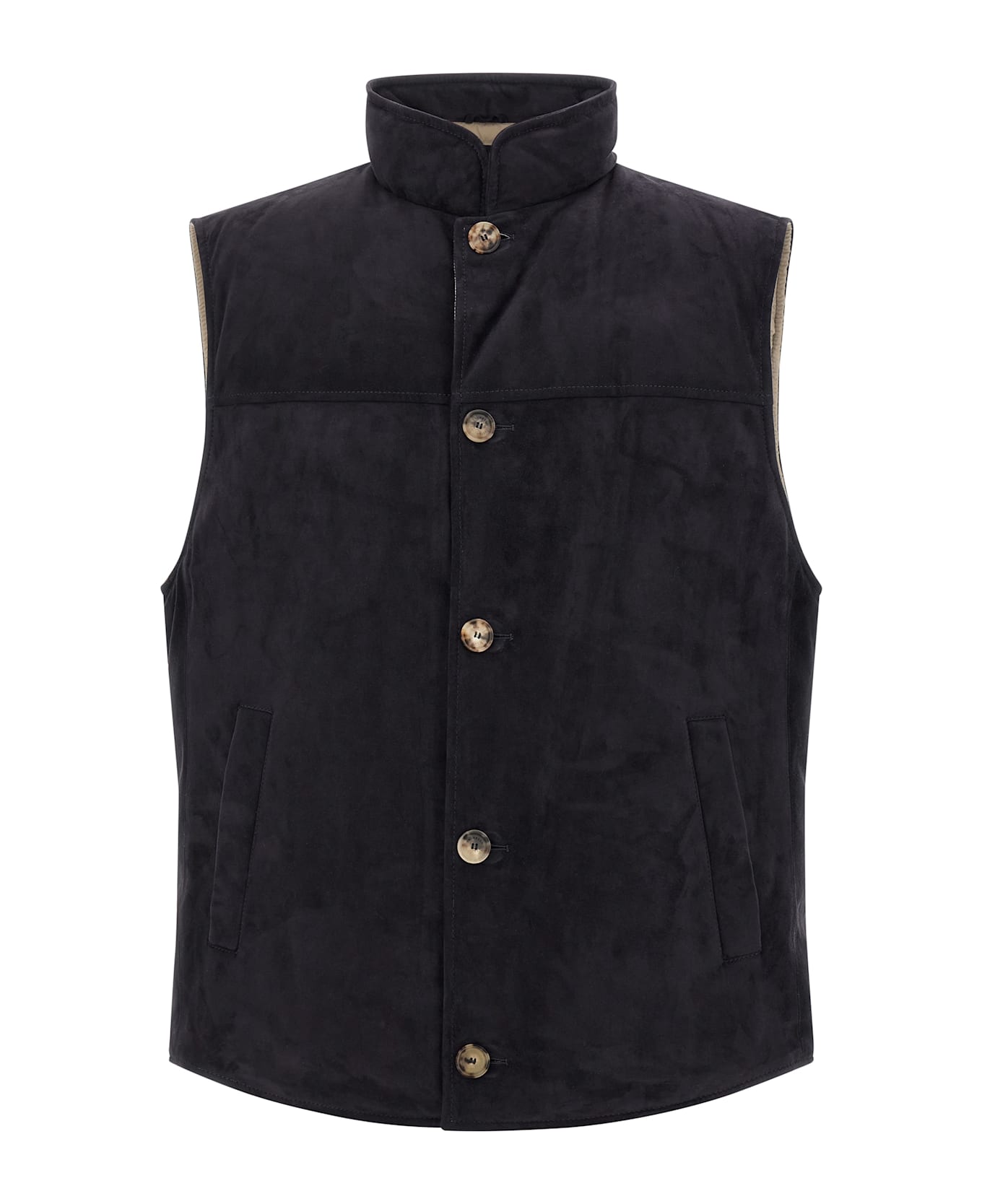 Suede vest, contrast quilted lining with goose down padding, high neck, front button closure, pockets. Composition: 100% lamb leather (Ovis aries)