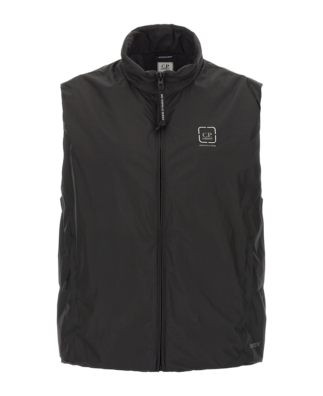 'The Metropolis Series' vest in Pertex®, an ultralight 2. 5-layer ripstop fabric with waterproof membrane and breathable micro-embossing on the back, padded in Primaloft® Evolve, standing collar, front zip closure, pockets, drawstring on the hem, elastic around the sleeve.