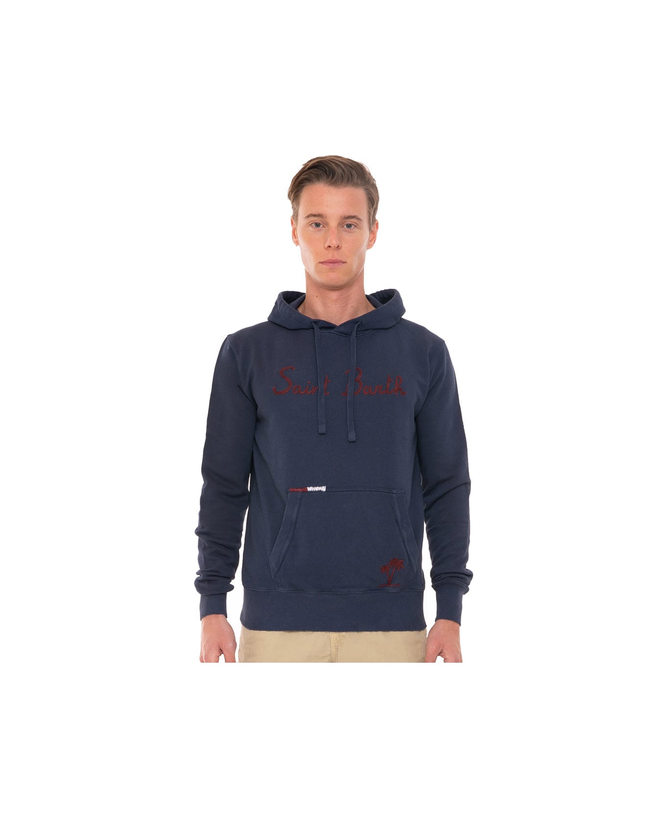 Men's Sweatshirt, Embroidery front print, slim fit, round necked, blue cotton fleece, long sleeves.
