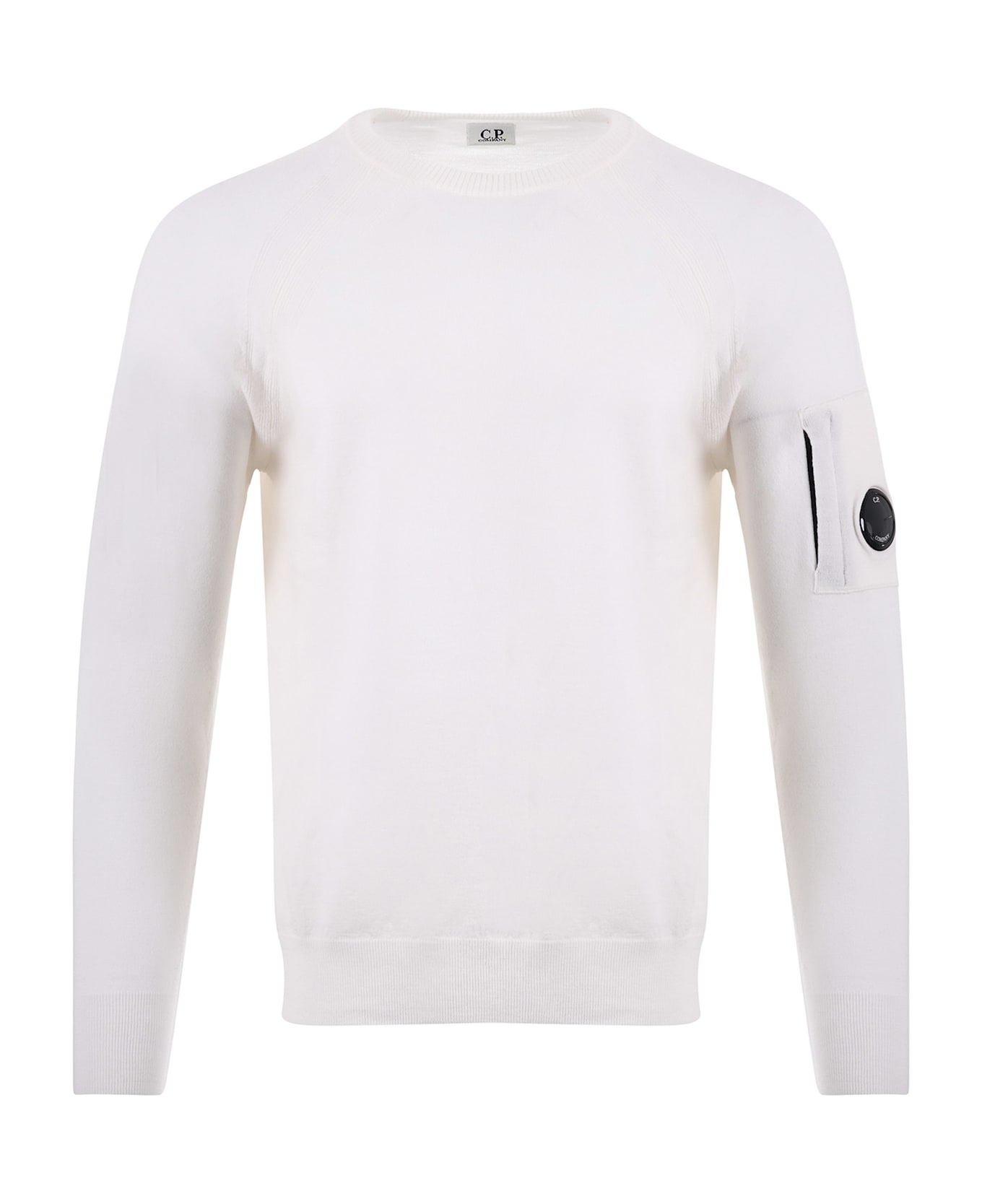 C. P. Company sweater in extrafine wool yarn. Crew neck. Long raglan sleeves. Pocket on the left sleeve with zip and lens. Ribbed cuffs and bottom. 88% virgin wool, 12% polyester Size in photo M