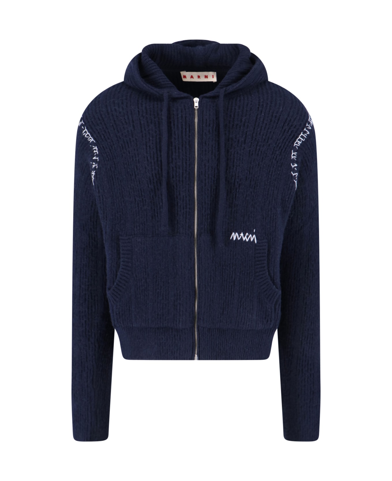 Marni knitted sweater in navy blue wool and cashmere blend, knitted, drawstring hood, zip closures, contrast stitching design, side logo, two side pockets, ribbed trim, and straight hem. Composition: 90% Wool, 10% Cashmere