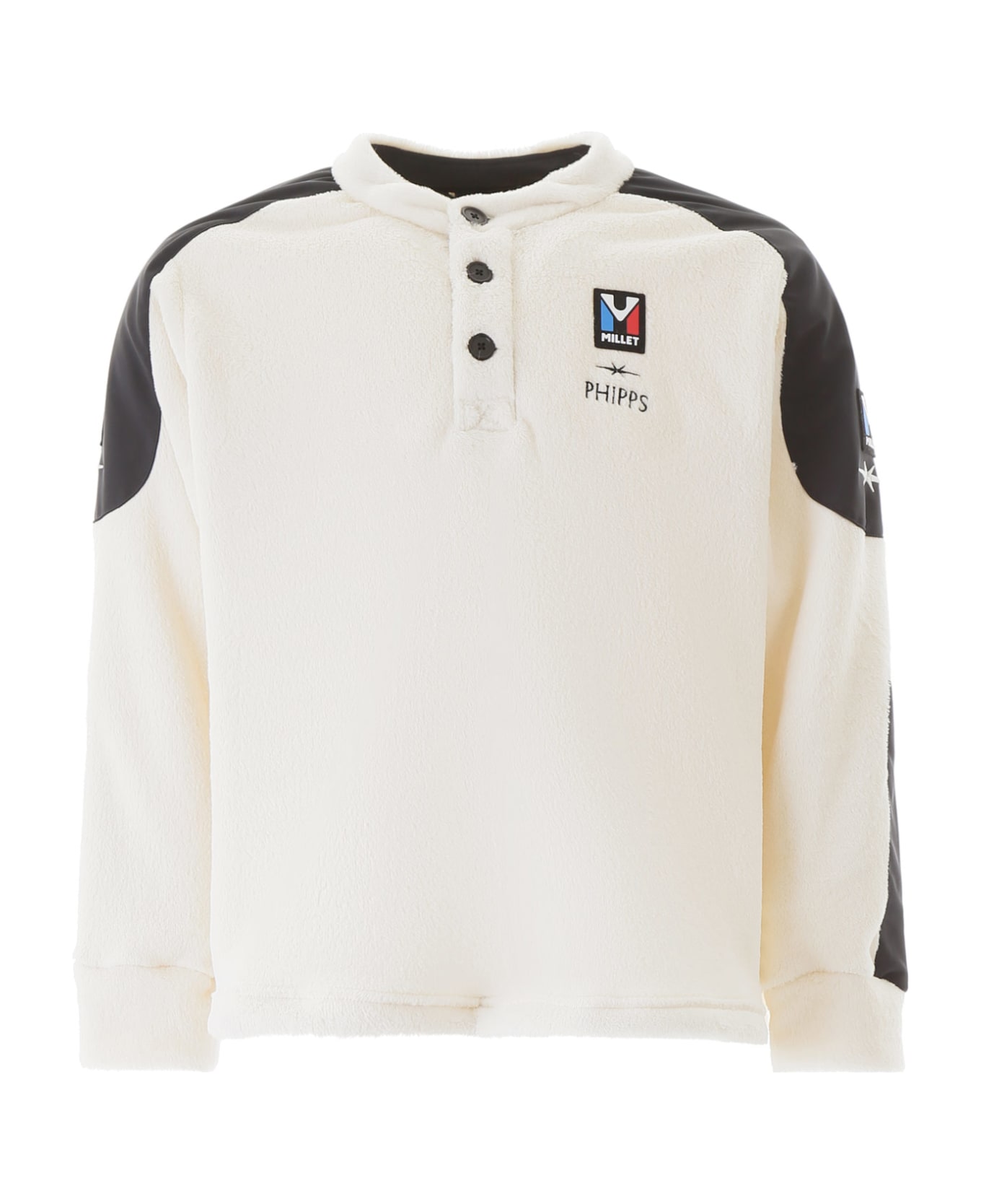 Phipps soft fleece sweatshirt designed in collaboration with Millet, featuring contrasting nylon inserts, both logos on the chest and sleeves, crew neck with front buttons. The model is 183 cm tall and wears a size M.