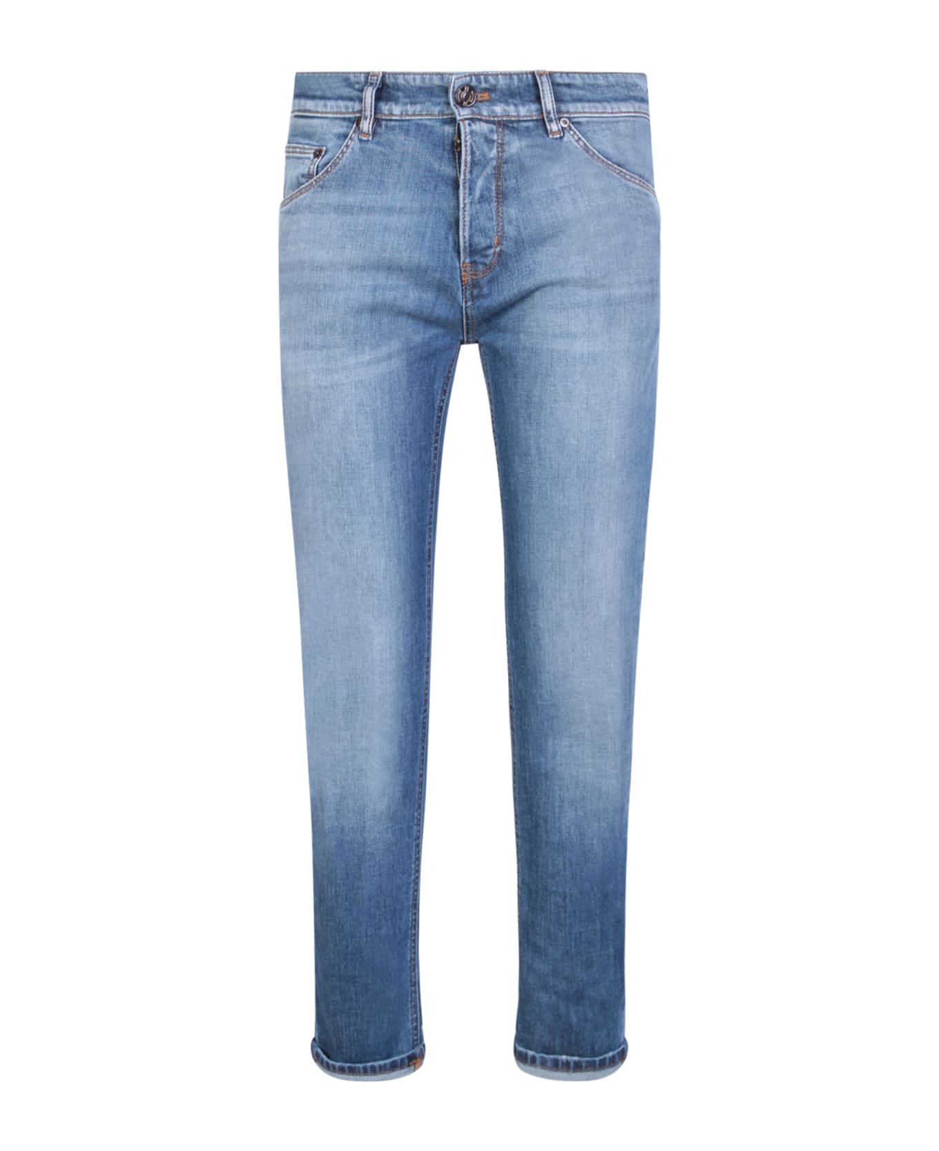 Mid rise. Front button and zip fastening. Belt loops. Classic five pockets. Slim cut. Distressed effect. Straight hem. Color: blue