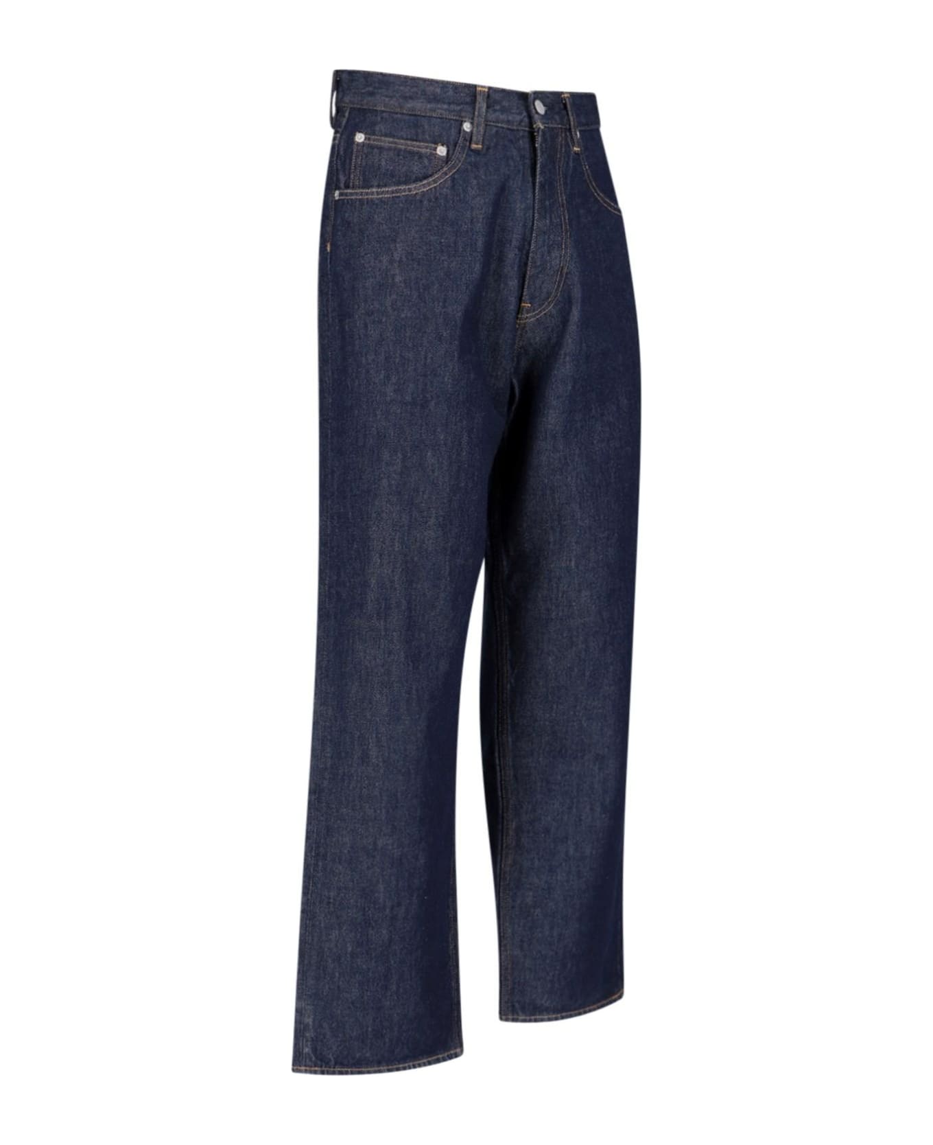 Auralee wide leg jeans in blue denim with mid waist, belt loops, medium waist, button and zip closure, five pocket design, straight leg.