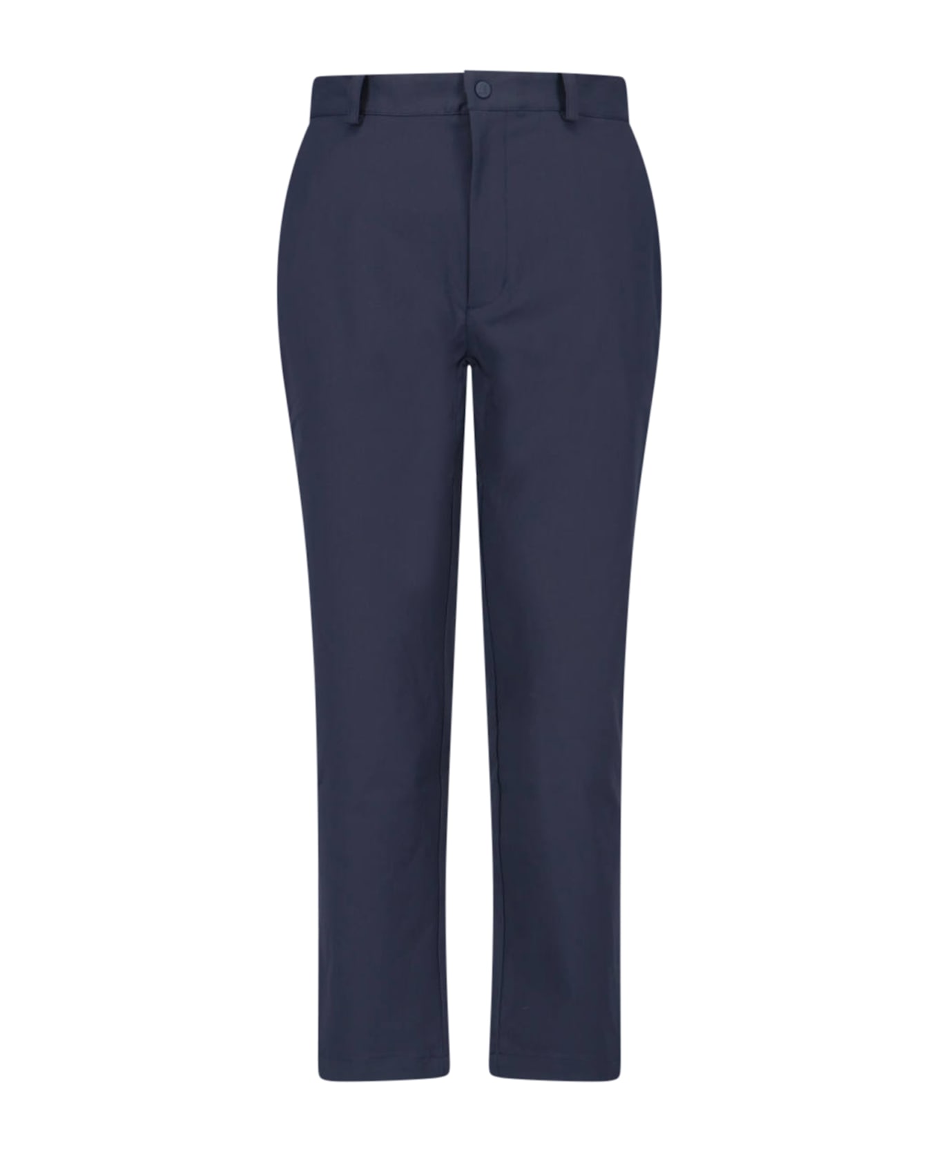 K-Way Elia chinos in navy blue fabric with mid waist, belt loops, button and zip closure, two side pockets, one welt pocket at the back, tricolor logo label on the back, straight leg.