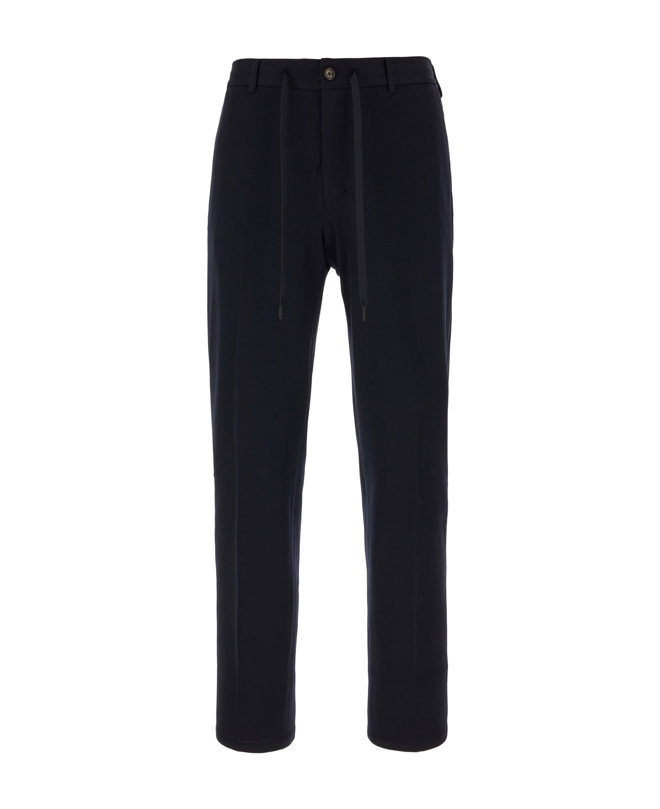 Pants realized in stretch cotton. -Partially elastic waist with drawstring -Belt loops at the waist -Concealed zip with a single visible button closure -Slant pockets and two slit pockets at the back -Central ironed pleat