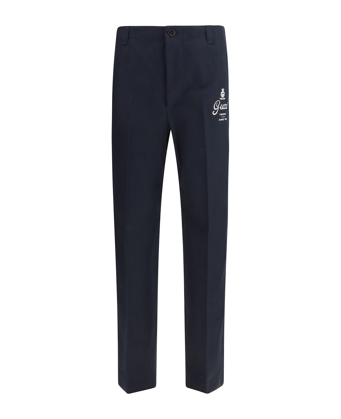 The compact cotton twill pants by gucci convey a confident, contemporary elegance. crafted from pure cotton twill, they feature the iconic gucci firenze since 1921 print on the front, a subtle nod to the house s heritage. finished with belt loops, a concealed zip and single visible button closure, slanted front pockets and rear welt pockets, they offer a refined yet versatile piece suited to elevated everyday styling.