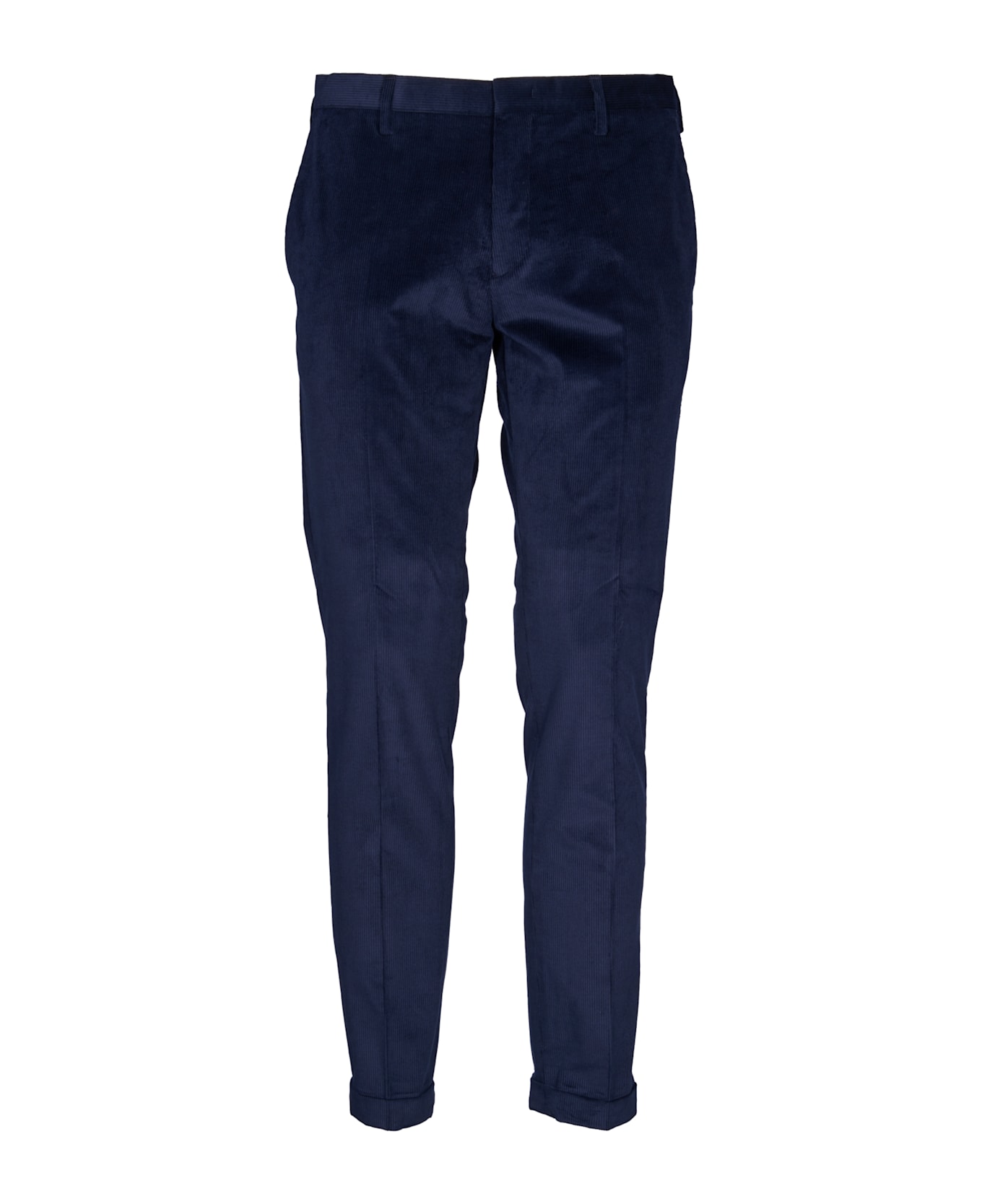 Blue velvet effect trousers with turn-up. America pockets. 2 back pockets. Zip, hook and button closure. Regular fit. Composition: 88% cotton 10% wool 2% elastane. Made in Portugal.