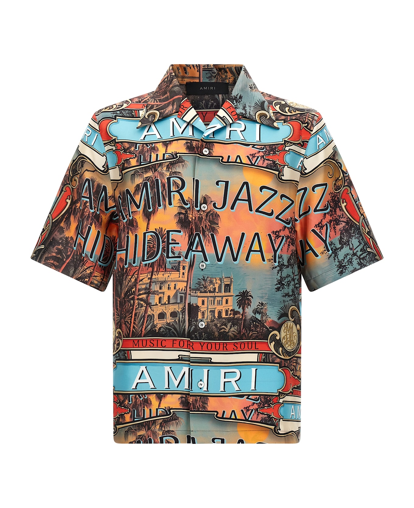 All-over 'Amiri Jazz Hideaway' print silk shirt with bowling style, button closure, and short sleeves.