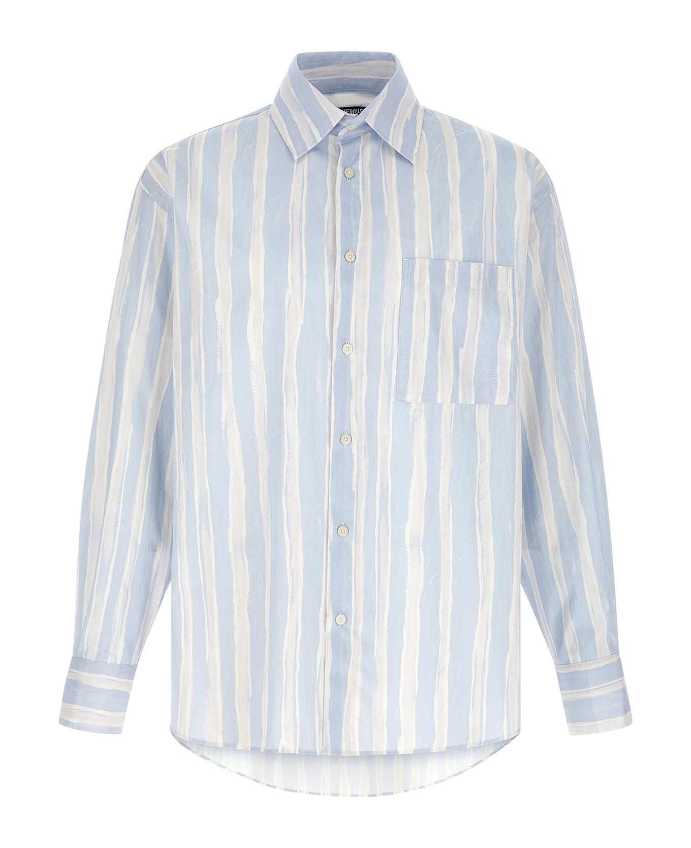 'La Chemise Camargue' striped cotton poplin shirt with paint effect, pocket with logo embroidery, front button closure, long sleeves with cuffs and dropped shoulders, asymmetrical hem. Composition: 100% cotton