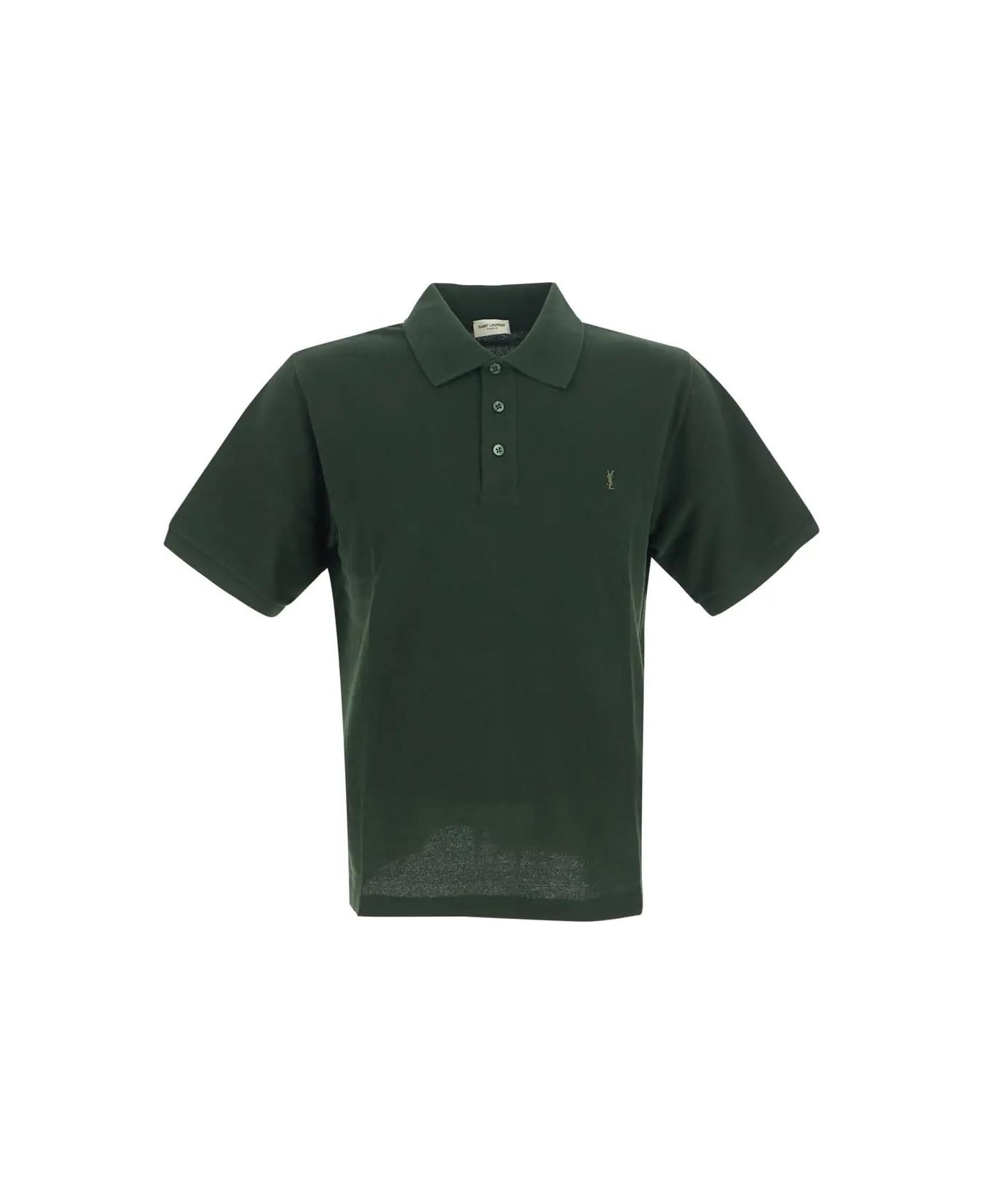 Saint Laurent polo shirt in dark green cotton/polyester blend with flat collar, short sleeves, three button closure, regular fit and tonal logo embroidery on the chest. Composition: 50% Cotton; 50% Polyester