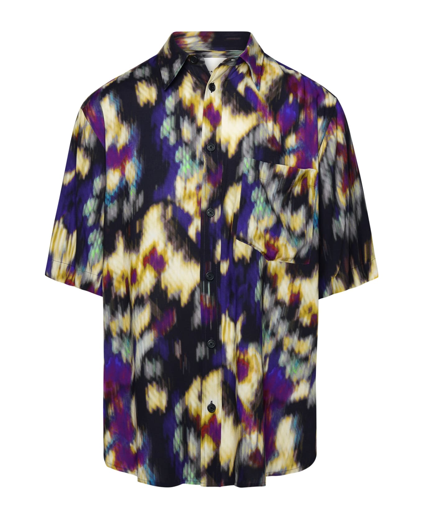All-over printed viscose shirt, pointed collar, front button closure, chest patch pocket, curved hem Composition: 100% viscose
