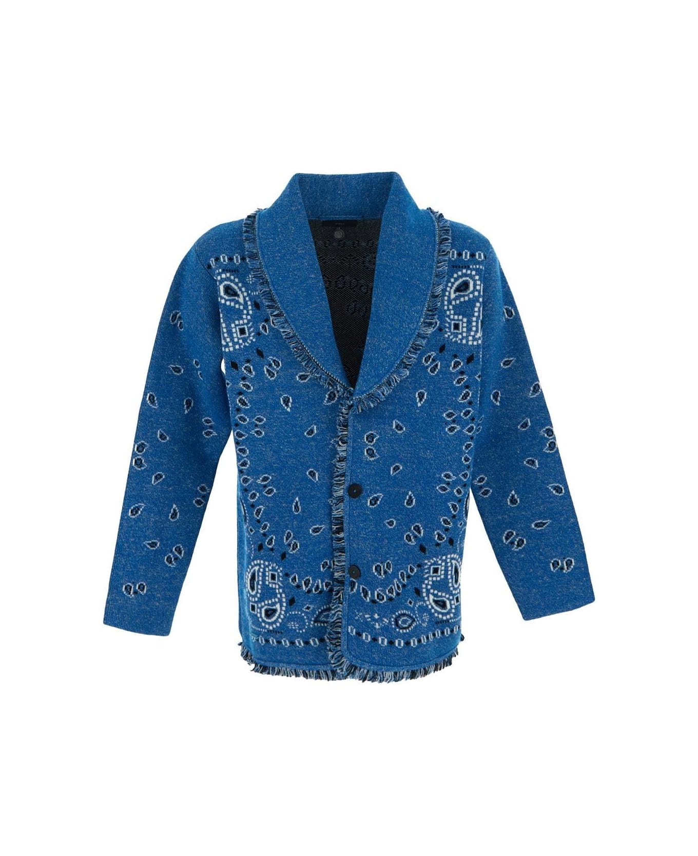 Alanui cardigan in blue cashmere with all-over abstract jacquard. It features by long sleeves and buttons closure. Composition: 100% Cashmere