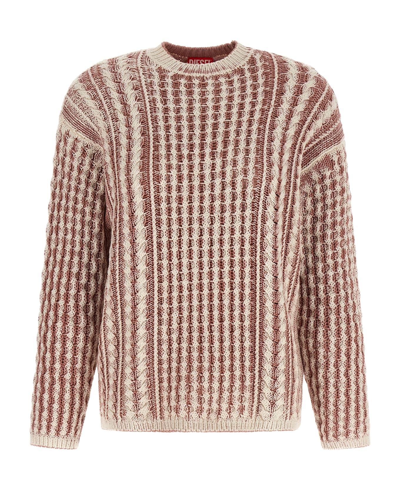 'K-Moise' cotton sweater with cable pattern, maxi Oval D logo with back intarsia, crew neck, long sleeves with cuffs and dropped shoulders. The garment is treated on the inner side with a special printing technique that creates irregular color effects on the outside, amplifying the texture with contrasts and shades.