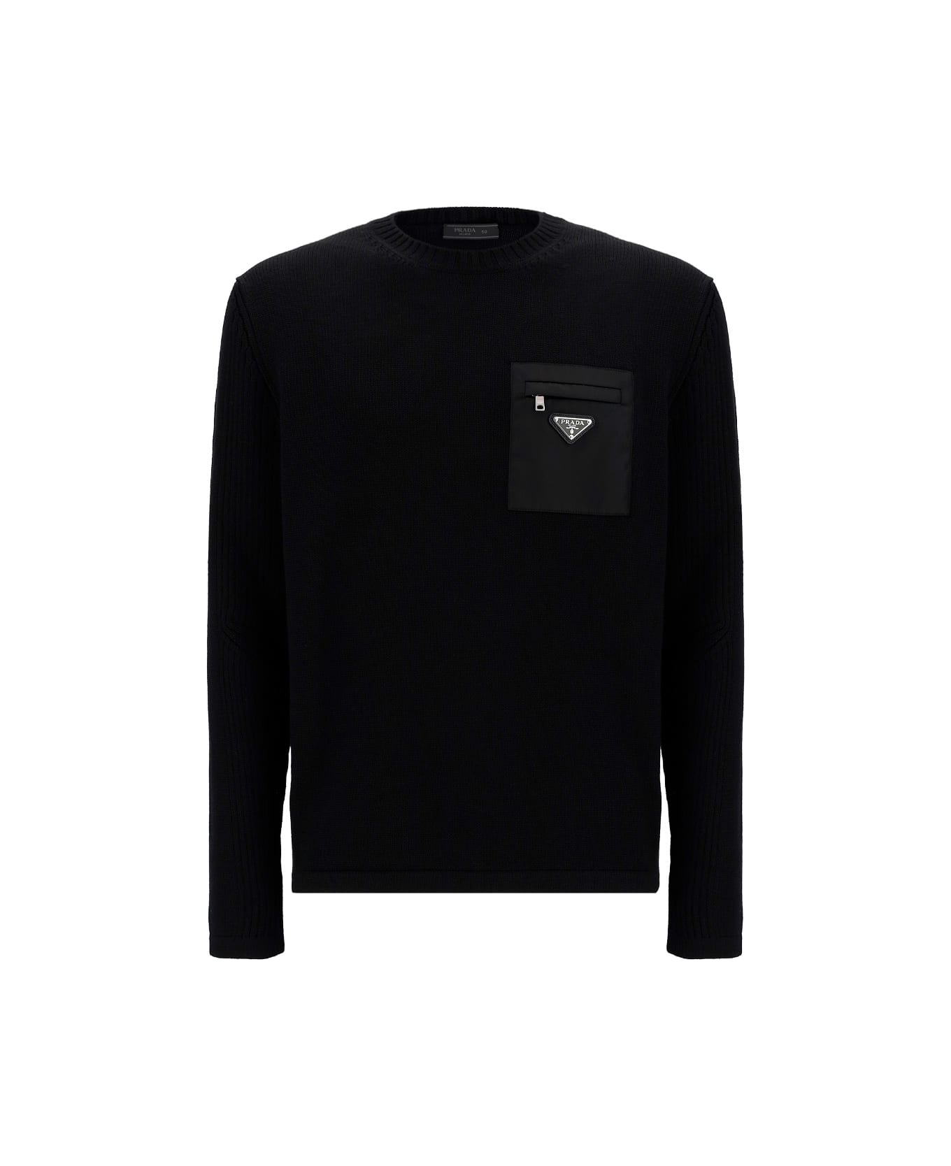 Virgin wool knitwear by prada, ribbed crew neck, zipper pocket applique on front, iconic triangular metal brand logo plaque on front, monochrome pattern. Composition: 100% % Fleece Wool