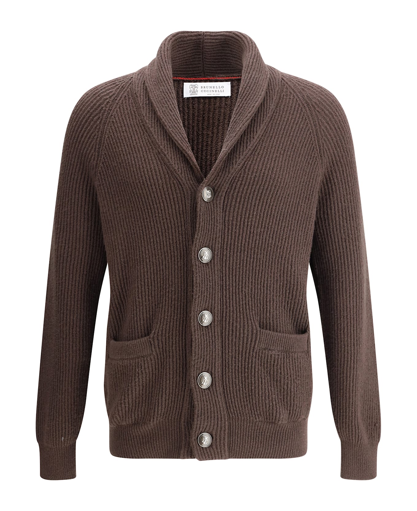 Brunello cucinelli's cotton cardigan is an elegant and versatile piece, featuring a shawl lapel that adds sophistication. the front button closure, enhanced by the brand's engraved logo detail, lends a distinctive touch. the two welt pockets on the front offer functionality and practicality, while the ribbed cuffs and hem ensure a snug, comfortable fit. the all-over repeated ribbed design adds texture and movement to the garment.