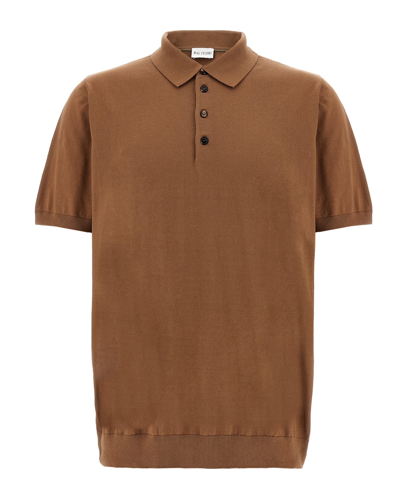Cotton knit polo shirt with collar, four-button closure, and short sleeves.