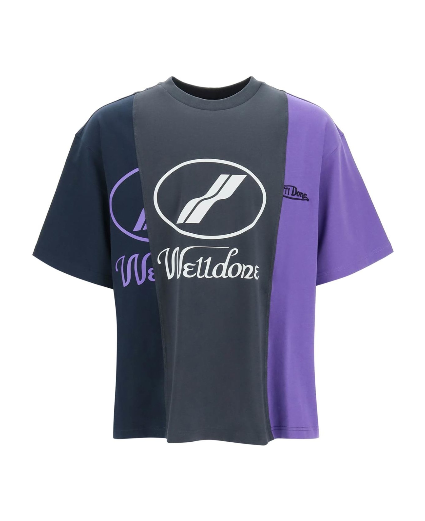 We11done crew neck t-shirt in pure cotton jersey, enhanced by a patchwork-effect three-panel construction with maxi reflective logo print at the front and rubber ID patch at the lower back. Ribbed collar, oversized fit. The model is 187 cm tall and wears a size L.