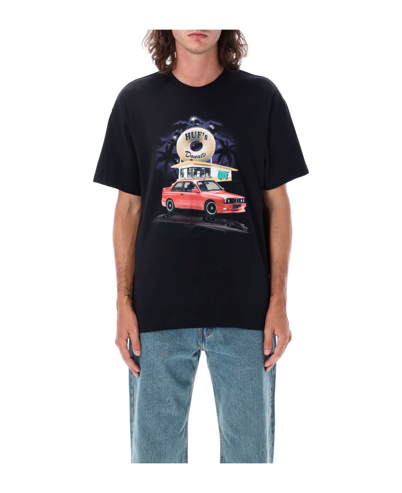 Drive T-shirt By Huf. Featuring: Relaxed Fit Classic Crew Neck Design Short Sleeves Colorful Car And Donut Shop Graphic Model Is 1,90m And Wears Size L.