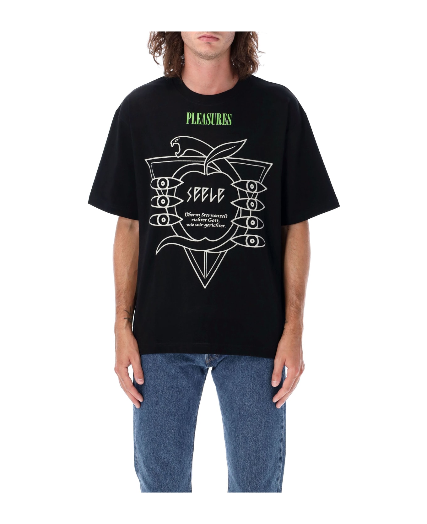 Evangelion Seele T-shirt By Pleasures. Featuring: Cotton Material Relaxed Fit Ribbed Crew Neck Design Short Sleeves Eye-catching Graphic Contrast Pleasures Branding Model Is 1,90m And Wears Size L.