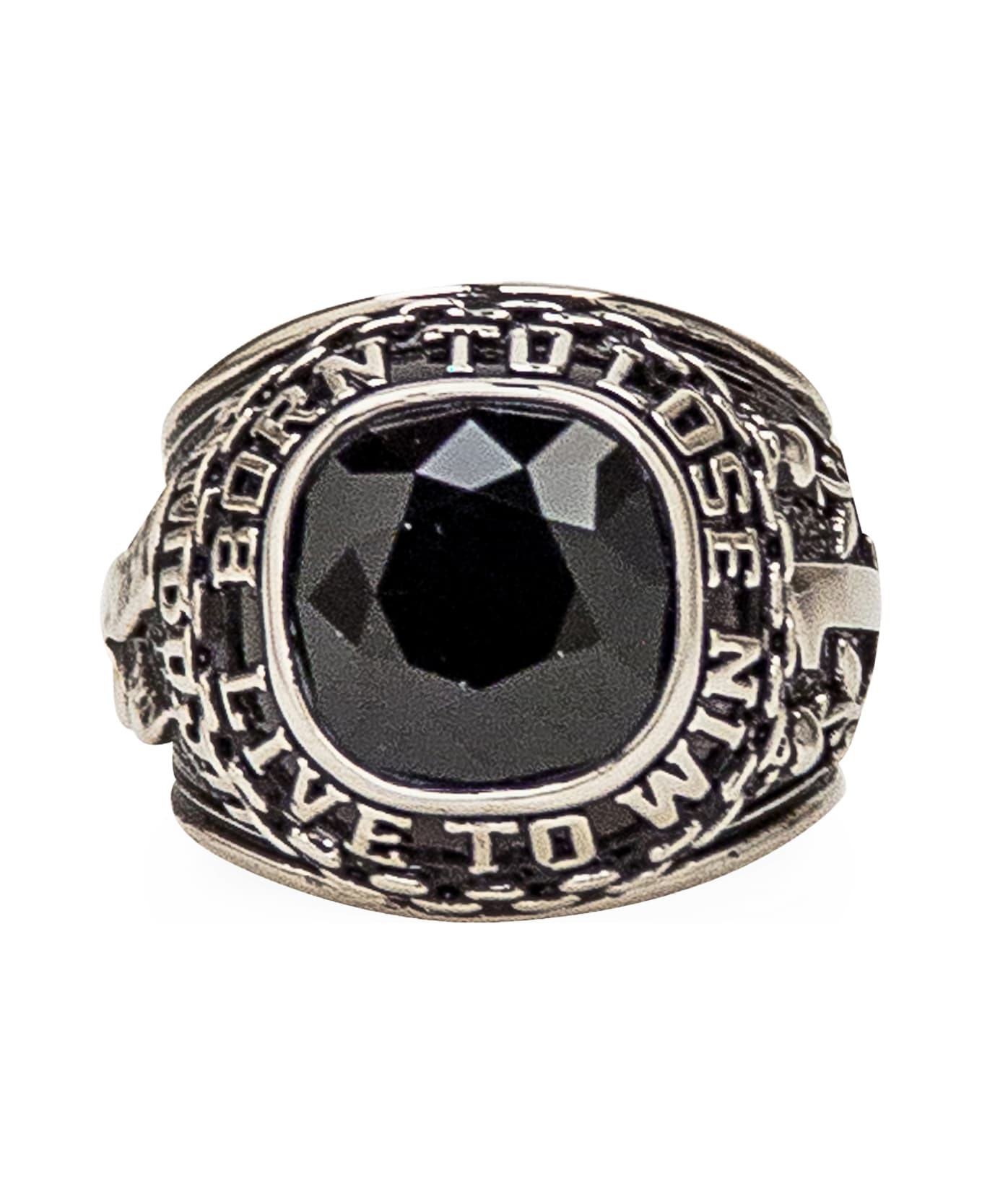 Silver ring with black stone. engravings with antique effect with embossed detail. Side logo.