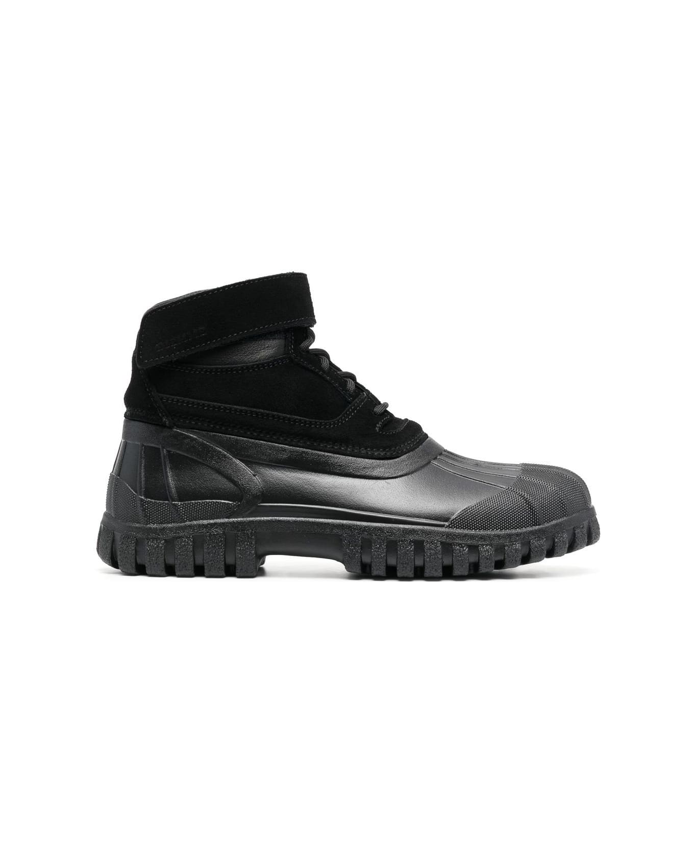 Anatra B-Ball ankle boots from DIEMME featuring black, calf suede, calf leather, tonal toecap, tonal stitching, front touch-strap over lace-up fastening, round toe, flat rubber sole and ankle-length.