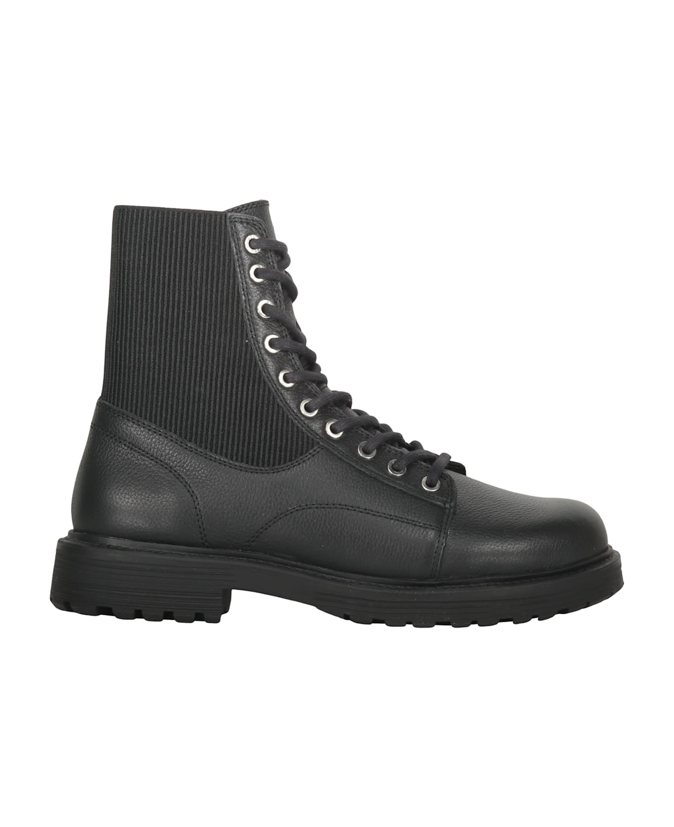 High boot for men in black leather with lace closure. it features a sturdy sole that offers resistance and comfort. the design is characterized by sharp lines and an elegant silhouette, making it suitable for various occasions. the leather craftsmanship ensures durability and style while the padded collar provides ankle support. perfect for tackling winter days with a touch of fashion.