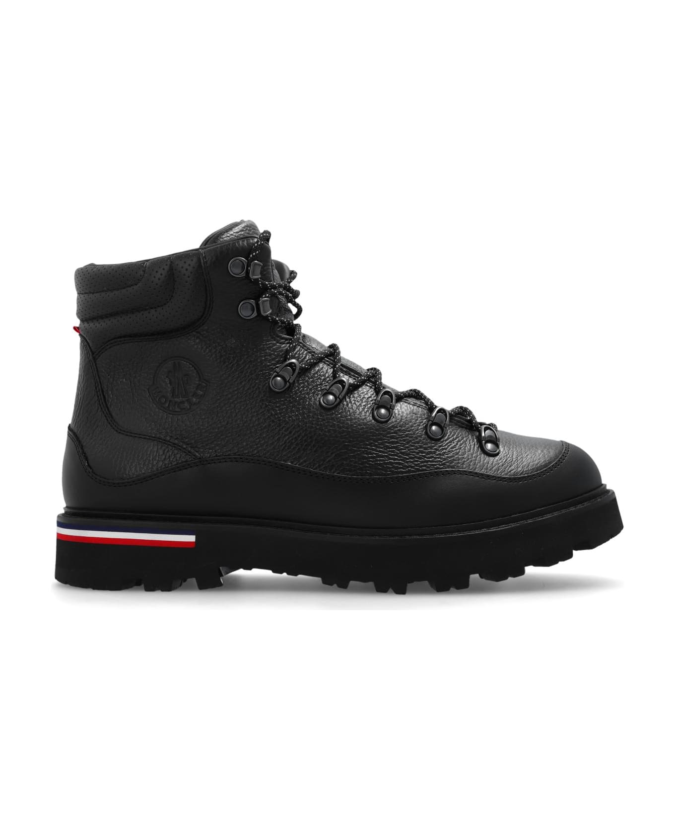 Black 'Peka Trek' boots from Moncler. Crafted from leather, this lace-up pair sits on a black rubber Vibram sole and features embossed logo details on the tongue and side.